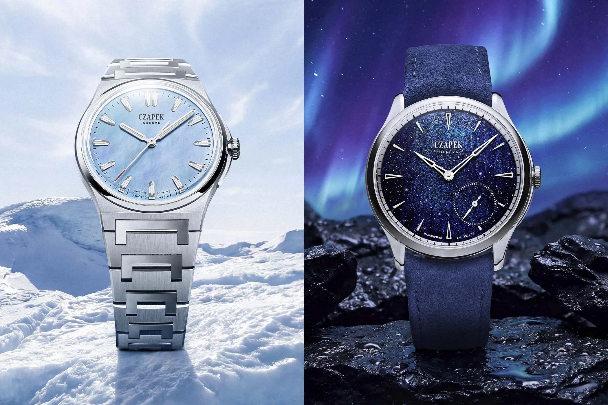 Czapek & Cie introduces two limited editions centered on elaborate mother-of-pearl dials: the Antarctique S Ice Cloud and the Promenade Midnight Pearl. The Antarctique uses a “nacre brouillé” technique to create cloud-like patterning under a blue-tinted varnish, while the Promenade pairs aventurine glass with a Tahitian mother-of-pearl base to evoke a starlit sky. Both watches use Czapek’s in-house SXH5 automatic movement and lean heavily into dial artistry as the headline feature. Prices are approximately $32,121 USD (CHF 24,900) for the Antarctique and $24,252 USD (CHF 18,800) for the Promenade.