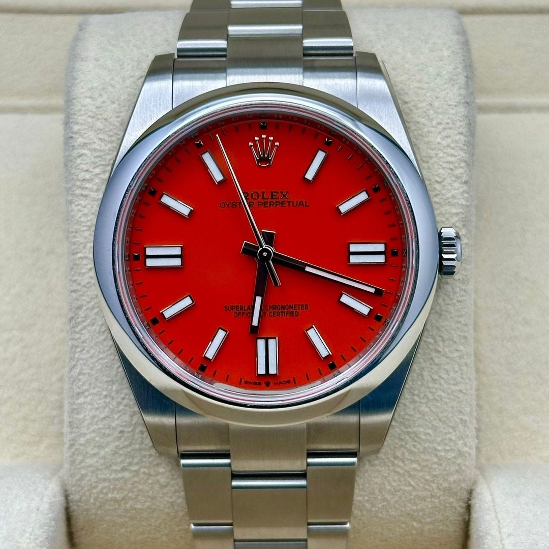 And that dial is the point. The Coral Red finish is not a sunburst, not matte, not timid. It is a saturated lacquer that reads somewhere between Ferrari and fire alarm depending on the light. When Rolex launched the colorful OP lineup—Turquoise, Yellow, Green, Candy Pink, and Coral Red—it felt like a calculated disruption of its own conservatism. Secondary market demand responded accordingly. Within months, these watches were trading at multiples of retail, with Coral Red often sitting near the top of the desirability ladder.