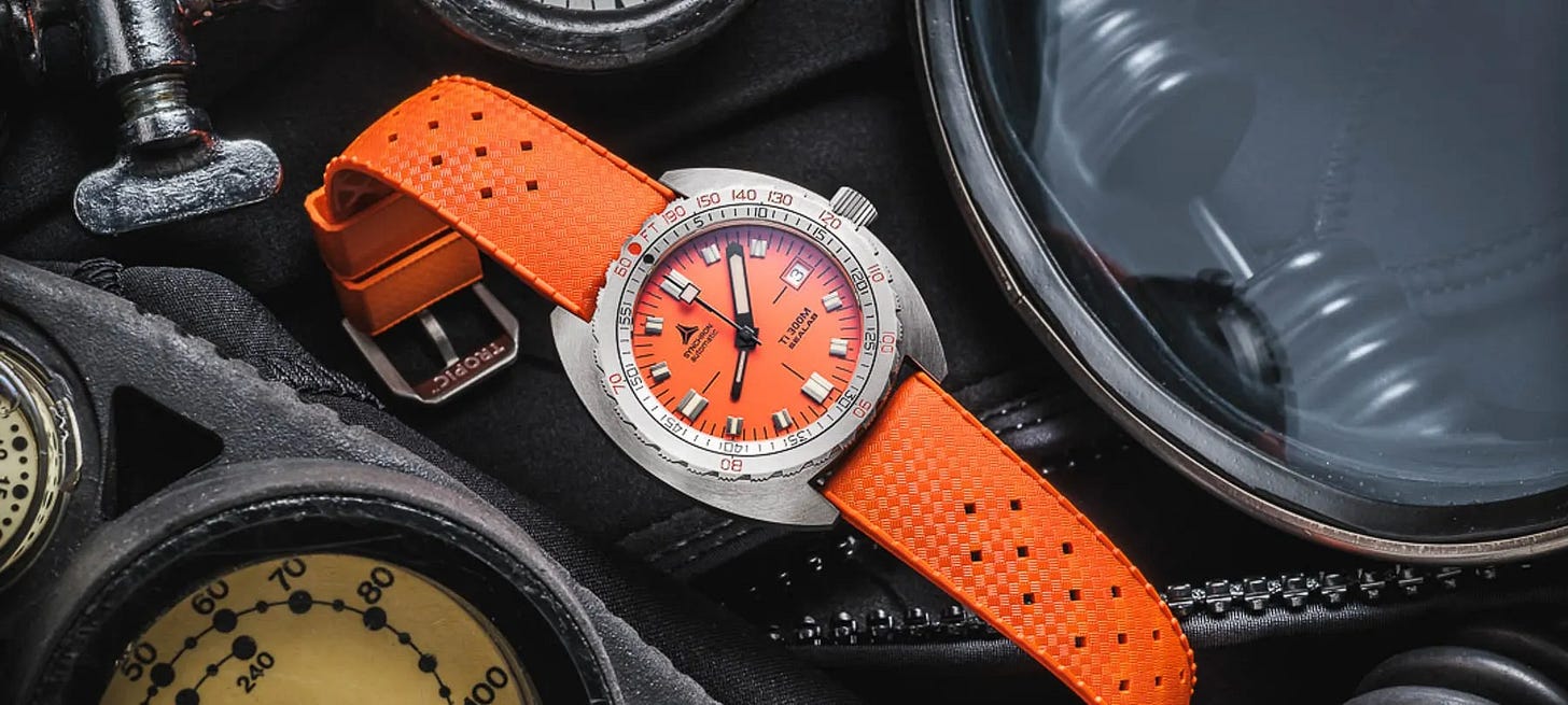 The Synchron Sealab Ti300M is a 300-meter dive watch in a brushed Grade 5 titanium case, measuring 41mm and notably thinner than previous Synchron divers. It pairs a flat, AR-coated sapphire crystal and a 120-click unidirectional bezel with a vivid orange dial, applied markers, and X1 Super-LumiNova for strong legibility, plus a clean black-on-white date. Inside is the La Joux-Perret G100 movement with a 60-hour power reserve, and the watch is offered as a $990 limited edition of just 500 pieces on pre-order. With its mix of vintage-inspired aesthetics, modern movement, and lightweight titanium construction, the Sealab Ti300M targets enthusiasts who want serious specs at a relatively approachable price point.