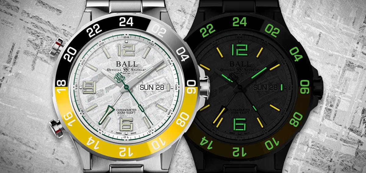 Ball expands its Roadmaster Marine GMT collection with new meteorite-dial models in 40mm and 42mm titanium cases, priced from about $3,999 and up (with the SGD 5,600 configuration working out to roughly $4,350). These watches pair lightweight titanium with ceramic bezels and tritium gas tubes for exceptional low-light legibility. The BALL RR1203-C movement is COSC-certified and, together with the patented quick-set GMT pushers, lets the wearer easily track three time zones. With 300 meters of water resistance and a robust tool-watch build, the Marine GMT is aimed squarely at travelers and adventurers who want both durability and visual drama from a genuine Gibeon meteorite dial.