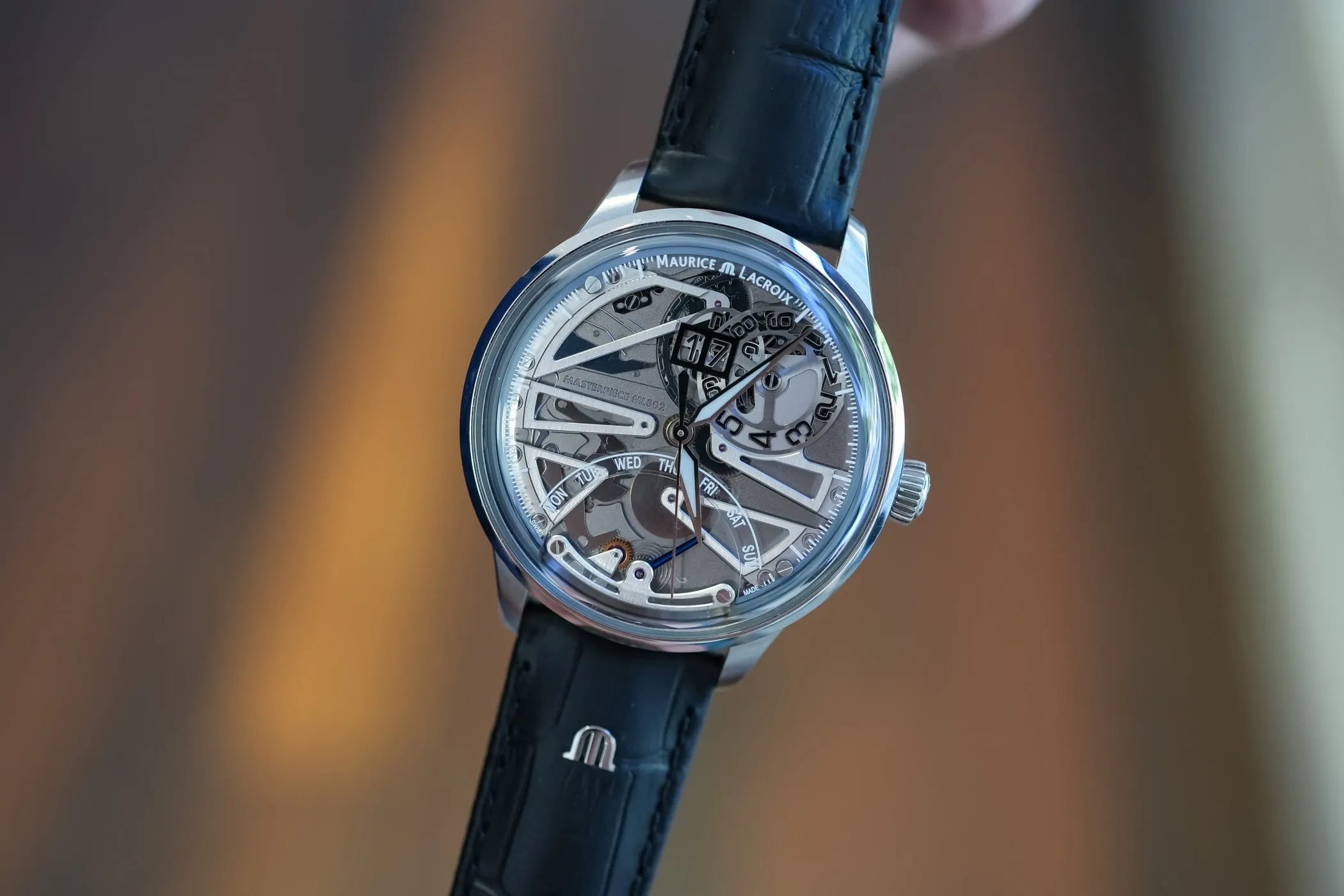The Maurice Lacroix 1975 Master Grand Date Retrograde marks the brand’s 50th anniversary with a 42mm stainless steel case, box-shaped sapphire crystal, and an openworked dial that showcases a large date and retrograde weekday display. Inside is the calibre ML302, based on the Sellita SW200‑1, with a proprietary module that drives the distinctive calendar layout visible beneath the dial. A black alligator‑embossed leather strap and 50m water resistance keep the look dressy but practical for daily wear. Pricing is CHF 6,950 (about $7,600 USD) or €7,950 (about $8,700 USD), positioning it as an upper‑mid luxury piece emphasizing display mechanics and anniversary storytelling.