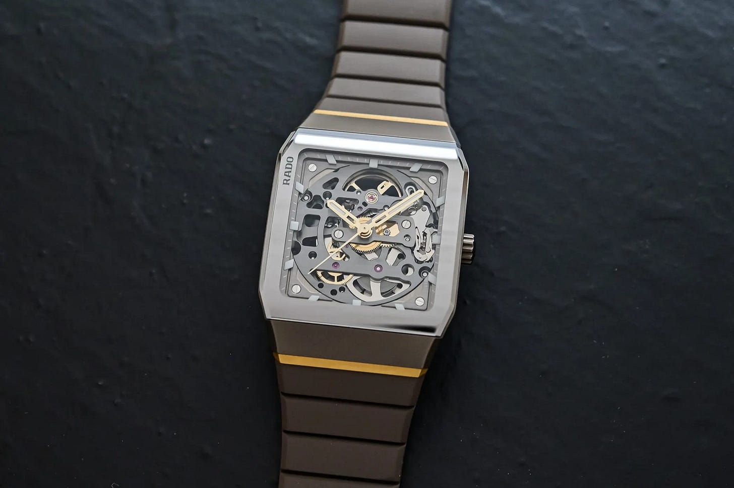 The new Rado Anatom Skeleton celebrates 40 years of the Anatom with a matte grey high‑tech plasma ceramic bezel and crown, a brushed steel middle case, and an ergonomically curved 32.5mm profile topped by a cylindrical sapphire crystal. Its skeletonized dial exposes the R808 automatic movement, highlighting grey bridges, yellow‑gold‑colored wheels, and a contemporary architectural feel. The movement offers an 80‑hour power reserve and improved anti‑magnetism thanks to a Nivachron hairspring, balancing everyday robustness with visual drama. Priced at €4,500, or about $4,950 USD, it sits as a modern design‑forward halo piece within Rado’s catalog.