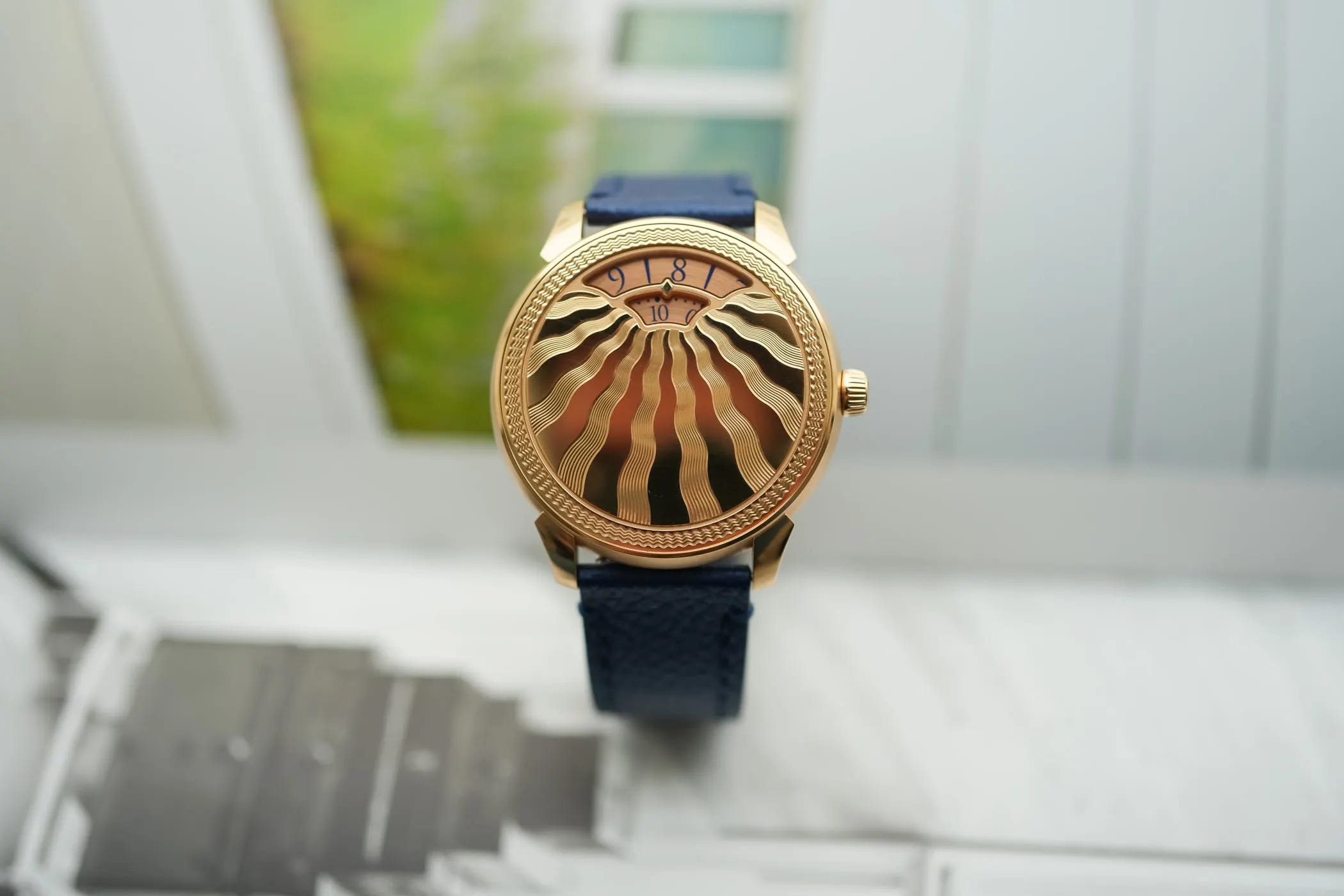 The Gerald Genta Geneva Time Only distills the brand’s architectural design language into a 38mm cushion‑shaped, time‑only watch in rose or white gold. A two‑segment smoked brown or silver‑grey dial with grained texture and polished indices emphasizes balance and depth. Inside, the automatic calibre GG‑005P (based on Zenith’s Elite 670) runs at 4 Hz and offers a 50‑hour power reserve, visible through the sapphire caseback. The watch is priced at CHF 25,000 before taxes, approximately $28,800 USD.
