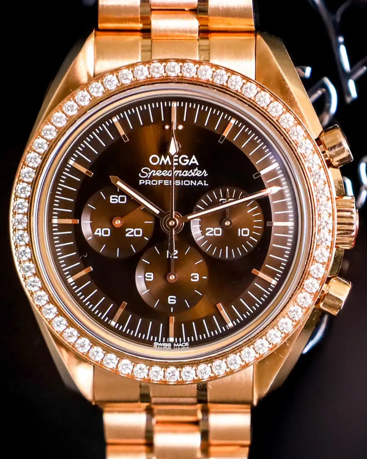 If the standard OMEGA Speedmaster Moonwatch is the utilitarian icon, reference 310.55.42.50.13.001 is its black-tie (or at least velvet-rope) counterpart: a 42mm Moonwatch executed in OMEGA’s 18K Sedna™ gold, topped with a diamond-paved bezel, and finished with a rich brown step dial that nods to the 4th-generation Speedmaster design language. It’s still unmistakably “Moonwatch” in silhouette—lyre lugs, asymmetrical case, tachymeter scale—just translated into precious metal with a lot more wrist presence (and a lot more billable confidence). The watch is typically described as featuring sapphire crystal on the front and an exhibition caseback, and it’s powered by the hand-wound Calibre 3861 Master Chronometer movement with approximately 50 hours of power reserve.