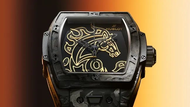 The Hublot Spirit of Big Bang Year of the Horse is a limited edition of 88 pieces that celebrates the Chinese New Year with a frosted carbon tonneau case. Its dial, formed from hand‑laid carbon fragments, depicts a dynamic Tang‑inspired horse outlined in gold‑plated brass, with no hour markers to preserve the artwork. The MHUB1710 automatic movement beats at 4 Hz, delivers 50 hours of power reserve, and is paired with a black calfskin‑and‑rubber strap. The watch is priced at $37,900 USD.