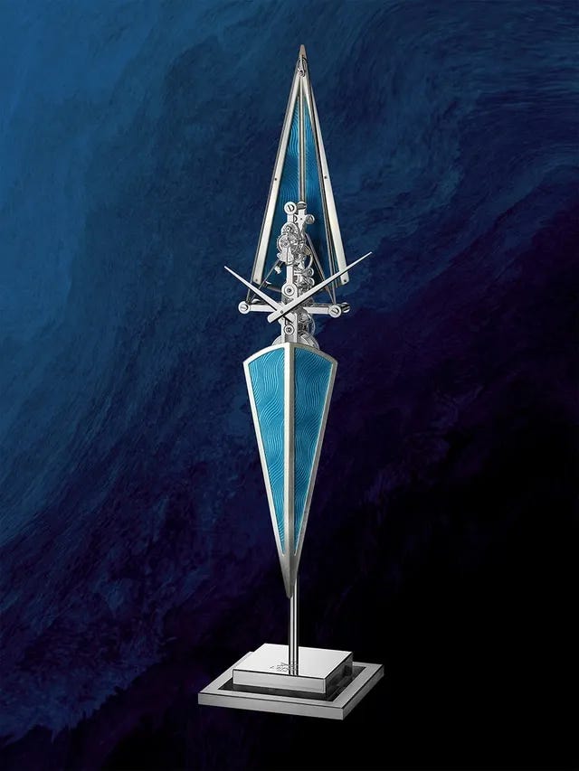 L’Epée 1839’s La Regatta Métiers d’Art is a sculptural clock that pairs racing‑skiff inspiration with traditional Grand Feu enameling. Each piece is unique and customizable, with layered enamel work that suggests movement, depth, and the rhythm of the sea. Beneath the art is an in‑house movement with an eight‑day power reserve, reinforcing the brand’s focus on mechanical integrity. Variants like La Regatta Umi and La Regatta Blue Horizon translate maritime themes into functional horological artworks for the home.