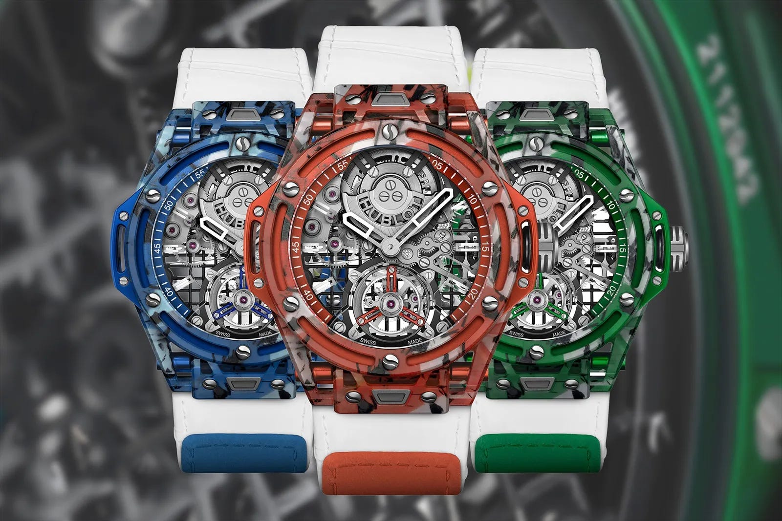 The Big Bang Tourbillon Novak Djokovic GOAT Edition pays tribute to Djokovic with a 44mm case made from advanced composites that incorporate upcycled polo shirts and rackets. Each of the three colorways represents a different tennis surface, and the total production of 101 pieces is tied to his career achievements. The HUB6035 automatic movement integrates a flying tourbillon and a bridge structure that evokes tennis racquet strings, providing a 72‑hour power reserve. Pricing is CHF 100,000, approximately $115,000 USD.