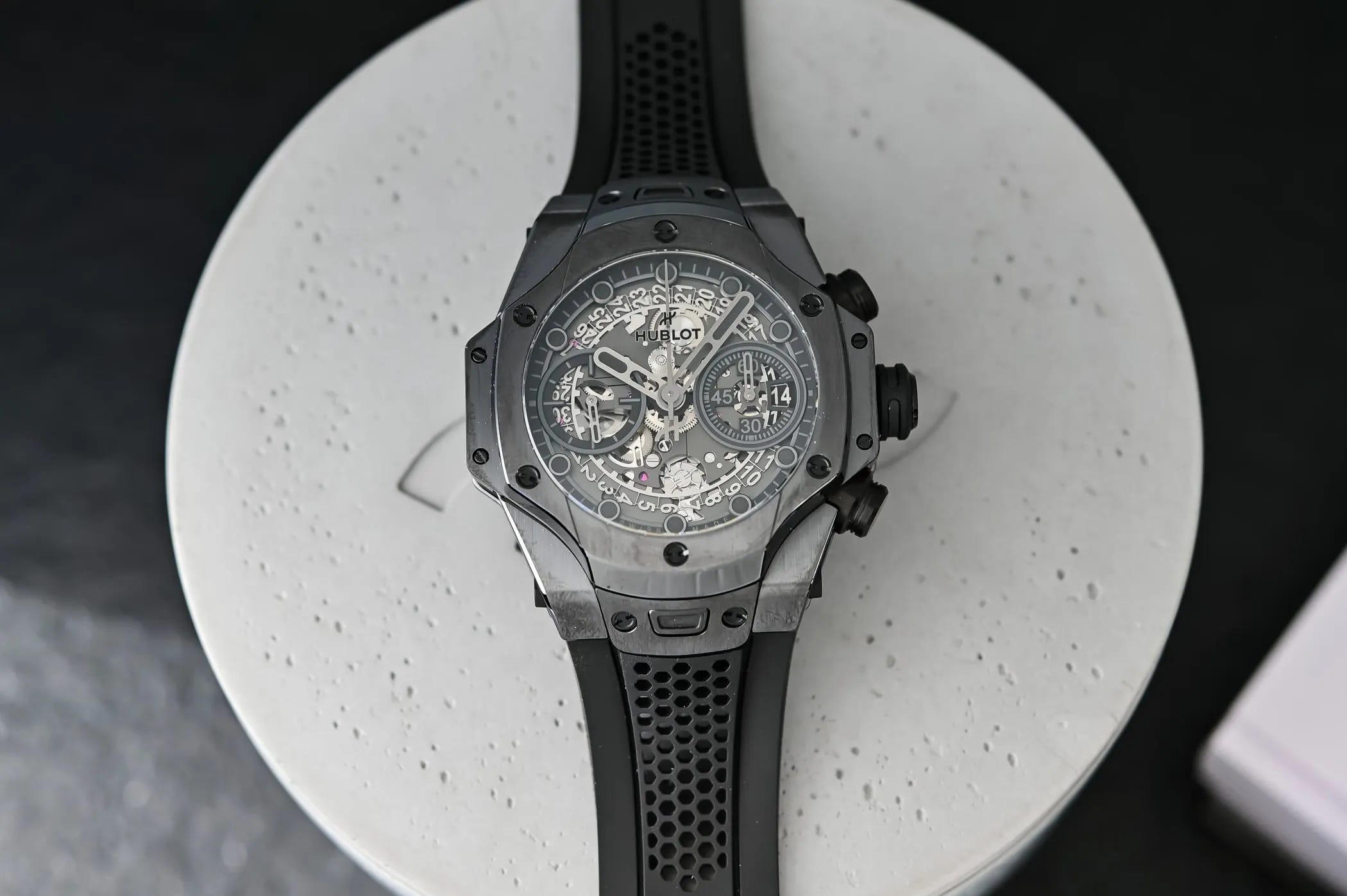 The Hublot Samuel Ross Big Bang Unico SR_A is a 200-piece limited edition that brings the British designer’s industrial, geometric aesthetic to a 42mm black ceramic Big Bang case. Its skeletonized dial exposes the in-house HUB1280 Unico flyback chronograph movement, offering a 72-hour power reserve behind rounded hands and black-lumed indices. A honeycomb-textured rubber strap and One-Click strap system round out the aggressively modern package. The watch is priced at CHF 25,900 (about $33,000 USD) or EUR 30,600 (about $36,000 USD).