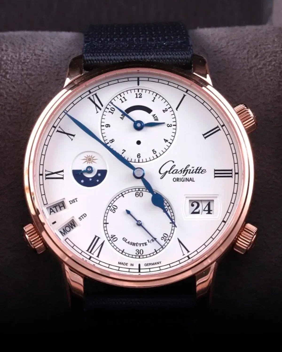 If you like travel watches in the abstract but you actually travel in real life, the 2024 Glashütte Original Senator Cosmopolite is one of the more intelligently engineered answers in the category—and the reference you’re looking at (1-89-02-01-05-61) does it in 44mm red gold with a restrained silver dial. The Cosmopolite’s calling card is that it doesn’t just show “a second time zone.” It’s built to handle a messy world of timekeeping: a time zone ring that accounts not only for the standard full-hour offsets, but also for half-hour and even quarter-hour time zones, with color coding that makes the deviation obvious at a glance. That’s a meaningful distinction versus the typical world-timer that assumes the world runs neatly on the hour.