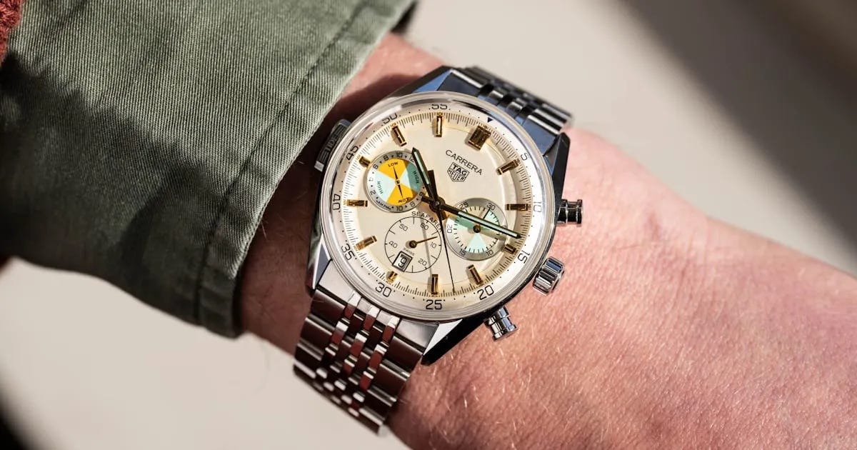 The TAG Heuer Carrera Chronograph Seafarer is a modern tribute to the vintage Solunar, combining a 42mm steel case with a dial that echoes the 1949 original’s tide-indicator layout. Its champagne-colored base is accented with light teal blue and yellow, giving the watch a distinctive nautical character while preserving everyday usability with a date window and automatic movement. Powered by the Calibre TH20-04 with an 80-hour power reserve, it offers robust performance and a brushed finish that suits both casual and dress settings. As the first non-limited Seafarer, priced at $8,800, it is aimed squarely at enthusiasts and collectors who appreciate historically inspired designs with modern reliability.