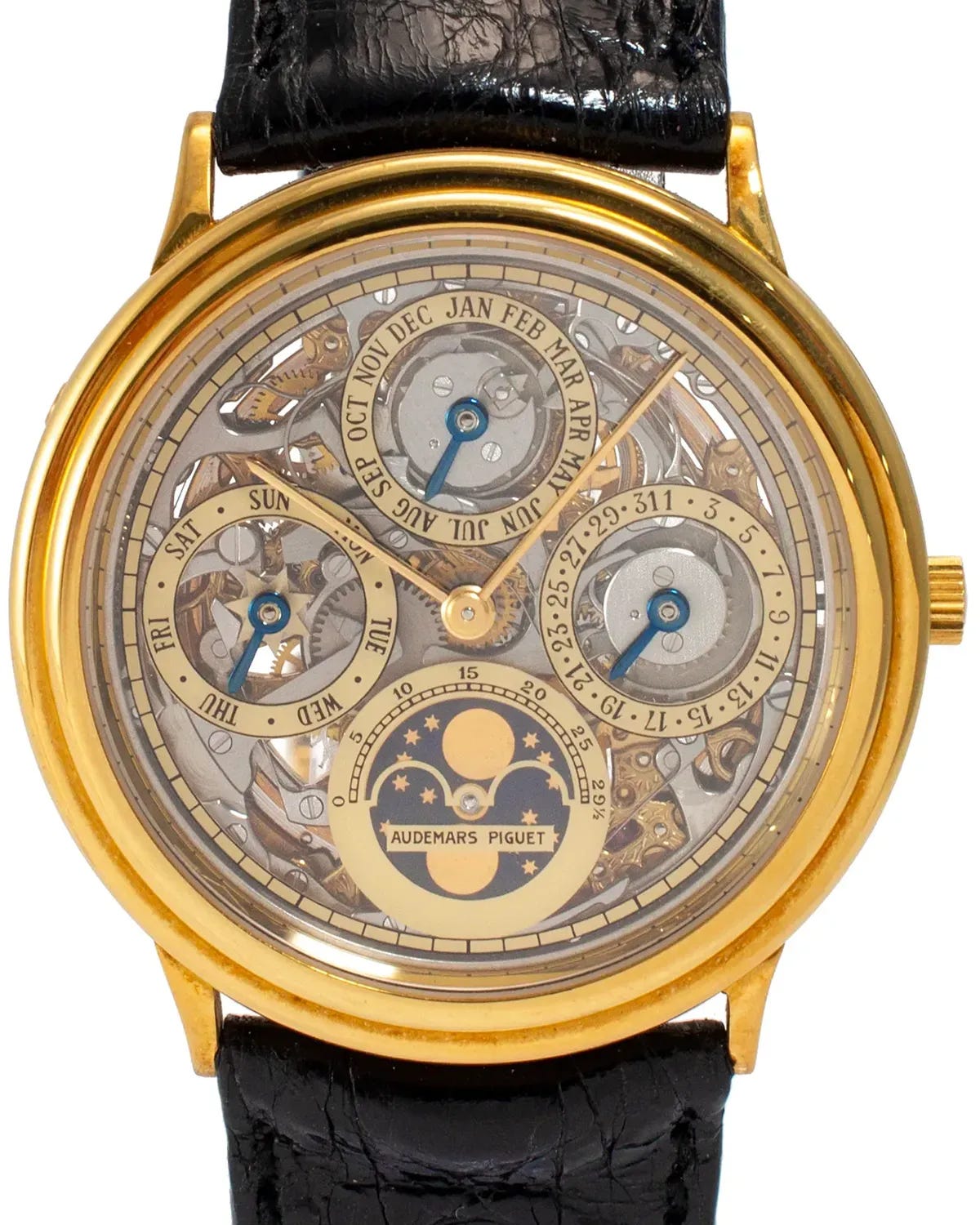 The seller describes this example as being in vintage condition, an important qualifier for a watch of this age and complexity. The 36mm yellow gold case retains the elegant proportions that defined Audemars Piguet’s dress complications of the late 20th century, with a smooth bezel that frames the skeletonized dial without distraction. The openworked dial is the defining feature here, revealing the architecture of the perpetual calendar mechanism beneath and allowing the owner to observe the interaction of gears, levers, and calendar cams that drive the day, date, month, leap year, and moonphase displays. Unlike modern skeletonized watches that can verge on theatrical, this execution remains restrained and highly legible, a testament to Audemars Piguet’s long experience with both skeletonization and perpetual calendars.