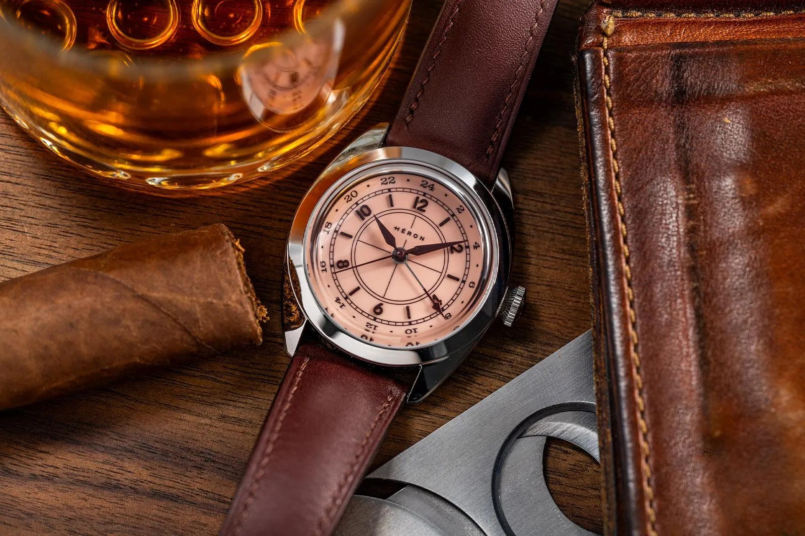 The Héron Mirabel GMT “Cigar Club” Edition channels early 20th-century style with a 37.5mm stainless steel case and a salmon-tone dial that transforms into a full-lume display in the dark. Its design is tailored to refined environments, evoking smoky lounges and classic cigar rooms while remaining compact and versatile on the wrist. Inside, the Miyota 9075 true GMT movement allows local time to be adjusted independently, making it highly practical for frequent travelers. Priced at $690 USD, the watch includes a tobacco-brown Baranil leather strap and offers a 42-hour power reserve along with standout nighttime legibility.