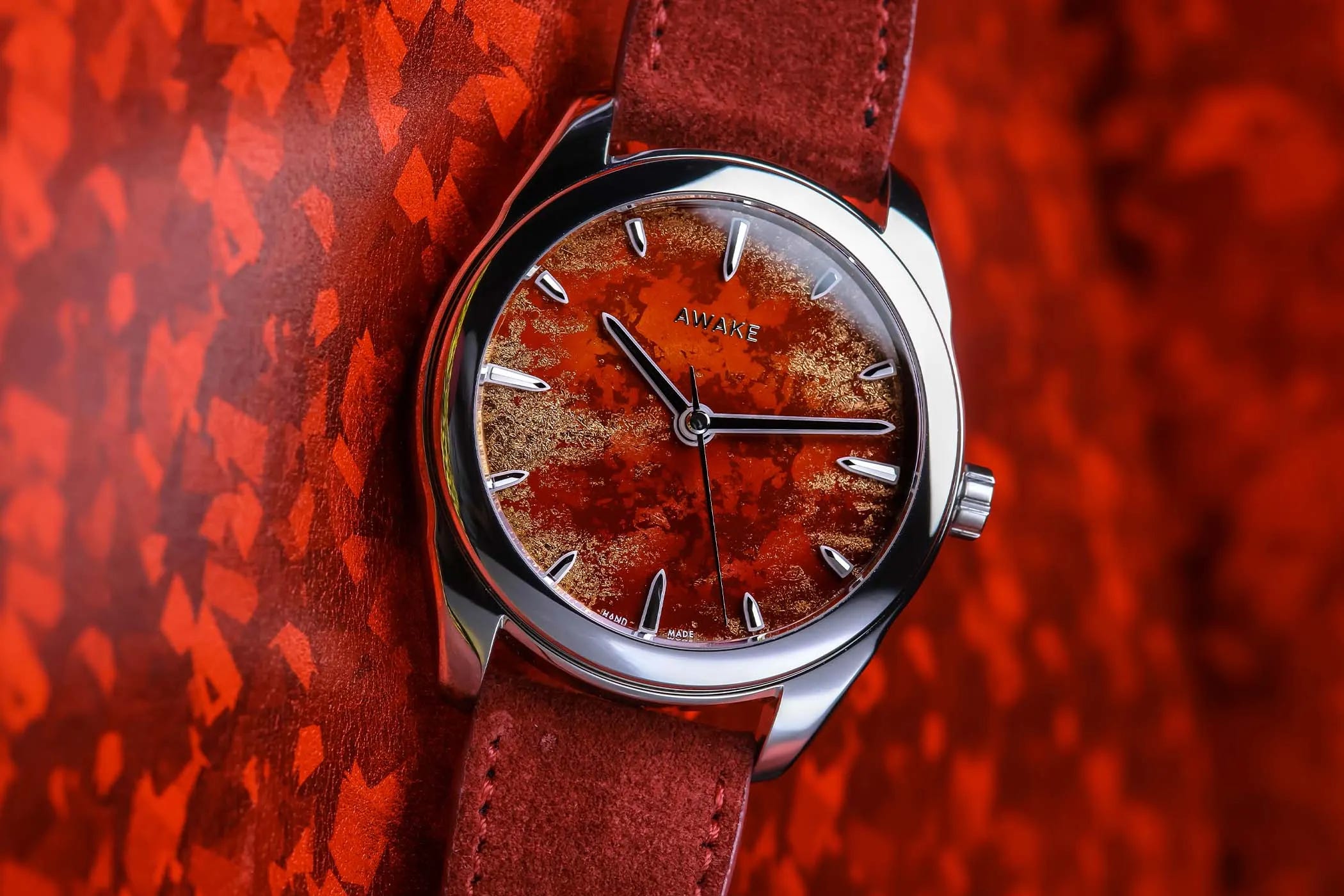 Awake expands its Son Mai collection with the Frosted Leaf Royal Red, a 39mm recycled stainless steel watch that blends polished and satin finishes with a handcrafted Vietnamese lacquer dial. The “Frosted Leaf” technique uses pure silver leaf tinted with copper pigments to create a richly textured surface that stands out in different lighting. Inside is the La Joux-Perret G101 automatic movement with a 68-hour power reserve, paired with 50 meters of water resistance for everyday versatility. Priced at EUR 2,200 (around $1,880 USD), it is limited to 100 pieces delivered in two batches and comes on a handmade red suede calfskin strap lined with rubberized leather.