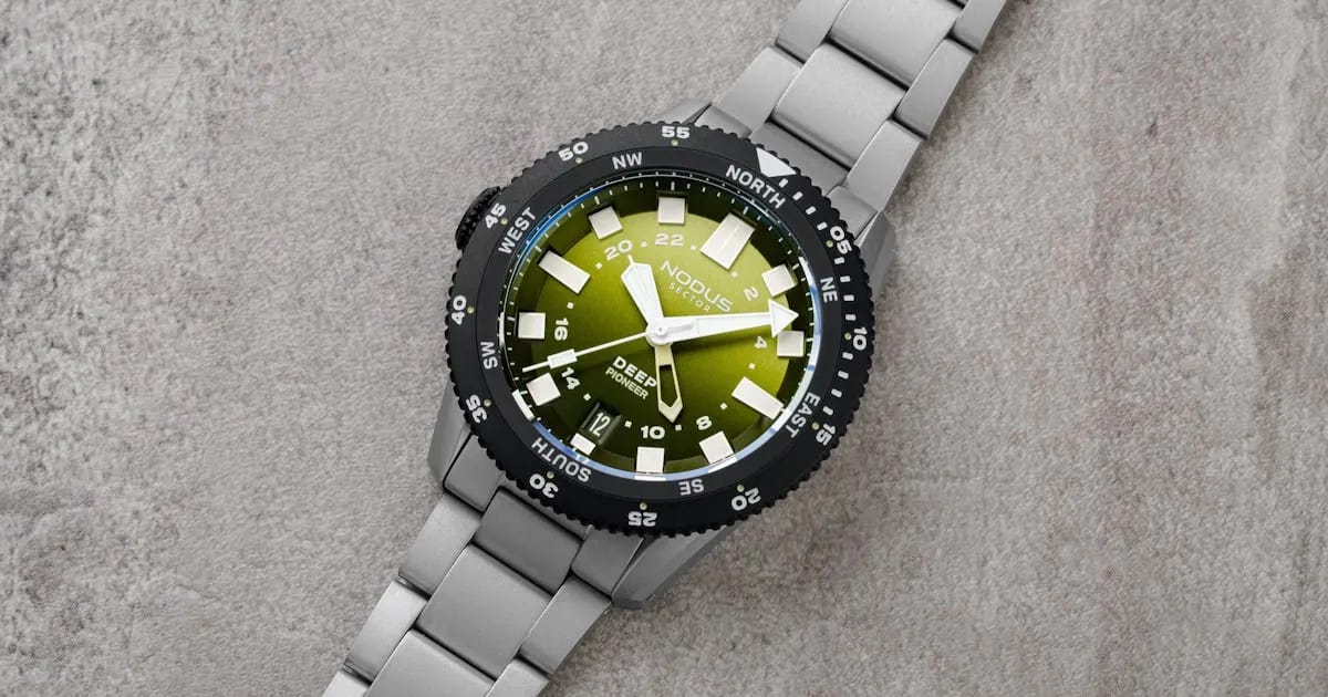 The Nodus Sector Deep Pioneer “Ranger” variant introduces a gradient green dial to the brand’s compact 38mm dive watch platform, paired with a bezel overhang to 42mm for added presence. Rated to 500 meters of water resistance and driven by a Seiko NH34 GMT movement regulated to around +/- 10 seconds per day, it is built for serious use as well as travel. A matte black DLC-coated bezel with dive markings and compass directions, plus generous Super-LumiNova and a sandblasted steel case and bracelet, underline its utility-first design. Priced at $625 USD, it continues Nodus’s focus on delivering robust, thoughtfully engineered microbrand value.