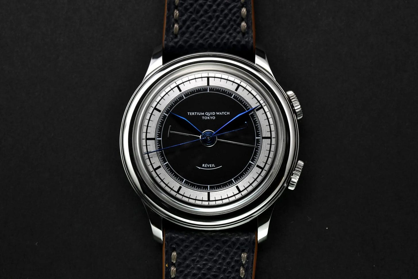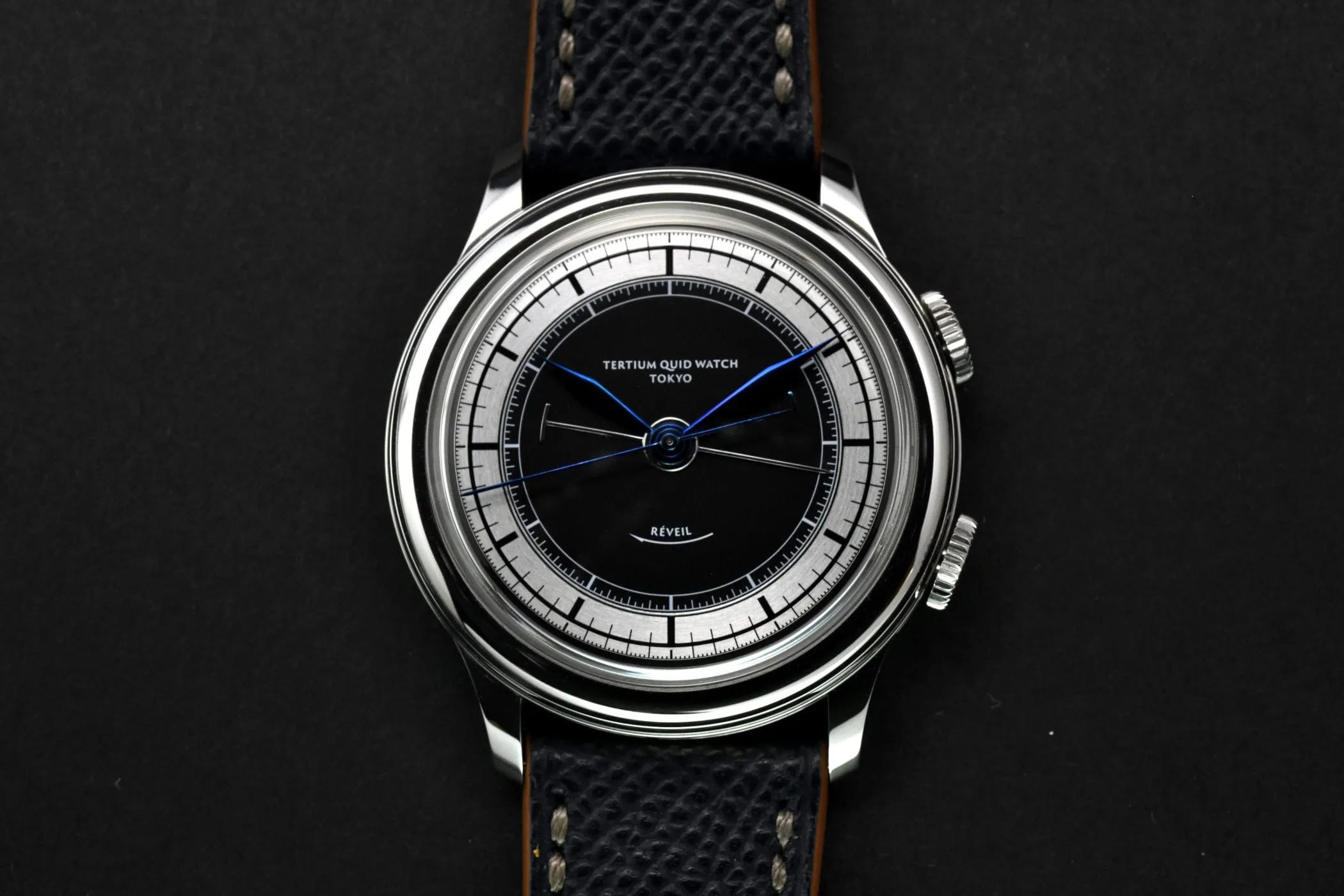 The Tertium Quid Watch Model R is a highly limited alarm watch from a new Japanese brand founded by collectors Shun Horiuchi and Taku Yamashina. Its 38mm polished steel case houses a vintage A. Schild AS1475 manual movement that has been restored and modified to provide a 40-hour power reserve and an on/off alarm function. The black-and-silver sector dial, dual crowns, and deep blue French calfskin strap give it a refined yet purposeful vintage character. Limited to only eight pieces and priced at JPY 4,600,000 (about $29,700 USD) before VAT, it targets connoisseurs of rare, mechanically interesting complications.