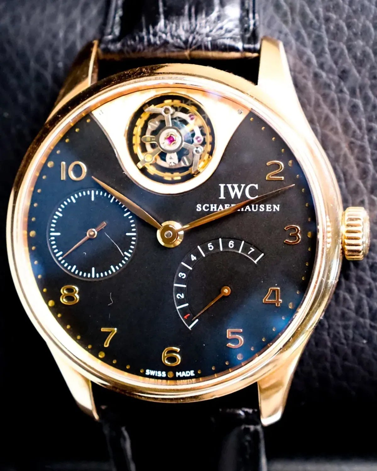 The IWC Schaffhausen Portugieser Tourbillon reference IW504210 occupies a very specific place in modern high horology: a large, classically styled complication from a mainstream Swiss manufacture that has long used the Portugieser line to showcase its most serious mechanical ambitions. This example, offered in a limited edition of 500 pieces worldwide, pairs a 44mm rose gold case with a black dial that highlights the brand’s restrained approach to complication design. The visual focus is unmistakably the tourbillon at 12 o’clock, balanced by a small seconds subdial at 9 and a power reserve indicator arcing between 3 and 6 o’clock, all rendered with warm gold hands and markers that play well against the dark dial.