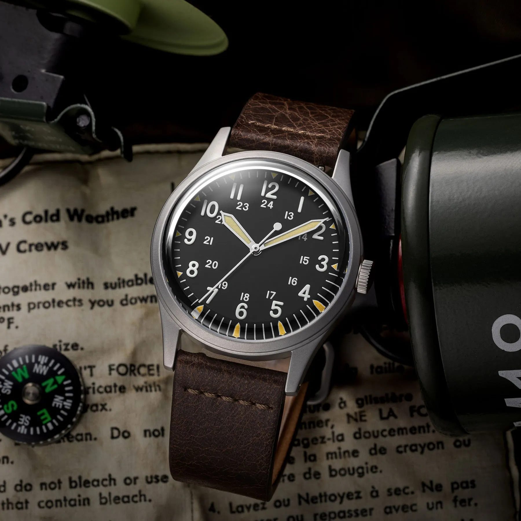 Praesidus has upsized its Jungle Field watch to 38mm, answering calls for a more contemporary take on the 1967 GG‑W‑113 spec originally designed for US military pilots. The new models keep the no‑nonsense field-watch formula: black dial, bold Arabic numerals, 100m water resistance, and a reliable Miyota 9039 automatic movement. Two dial options are offered, one with creamy vintage-style numerals and one with crisp white printing, each available on brown leather or green canvas straps. At $550 USD, the Jungle Field Automatic 38 delivers a genuinely rugged, military-inspired piece at an approachable price.