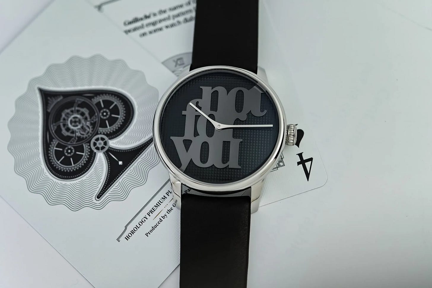 This 39mm Louis Erard x Monica Bonvicini collaboration turns the artist’s provocative “NOT FOR YOU” installation into a wearable statement piece. A polished steel case, black Clous de Paris guilloché dial, and mirror-polished text highlight its conceptual roots and critique of elitism in art and luxury. Inside is the automatic Sellita SW 261-1 with a 38-hour power reserve, paired to a black Baranil calfskin strap for a clean, contemporary look. Priced at CHF 3,900 (about $5,000 USD), it functions as both a daily-wear watch and a conversation-starting art object.