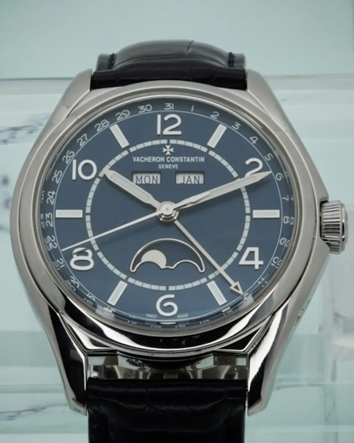 If you’re buying this to wear, the Fiftysix Complete Calendar in petrol blue is one of the more civilized ways into complicated Vacheron Constantin—useful complication stack, elegant dial, and the kind of movement finishing you don’t get “by accident.” If you’re buying this as a value play, be disciplined: the market has been telling us for years that this reference is more “buyer’s market” than “hot commodity,” which is precisely why it can be a smart acquisition—so long as you don’t bid like it’s an Overseas.