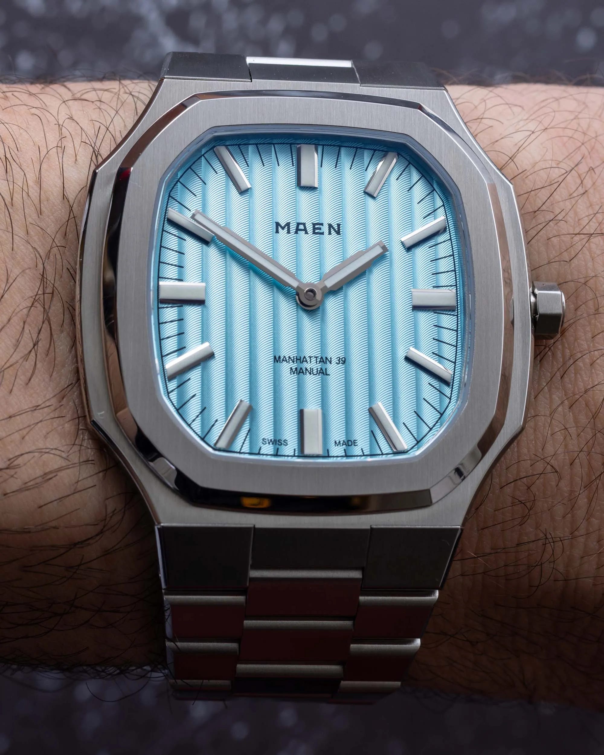 The Manhattan 39 Ultra Thin delivers a sleek, integrated-bracelet look without chasing the price tier of icons like the Nautilus or Royal Oak. At 39mm wide and only 6.9mm thick, it wears flat and dressy, powered by a hand-wound ETA Peseux 7001 with roughly a two-day power reserve. Its “airplane window” oval dial, vertical striping, and applied markers create a distinctive face, especially in colors like the ice-blue variant, though contrast can make some dial text harder to read. With a well-finished three-link bracelet and butterfly clasp, it comes in at $1,354 USD, positioning itself as a thoughtful, original take on the slim steel sports watch.