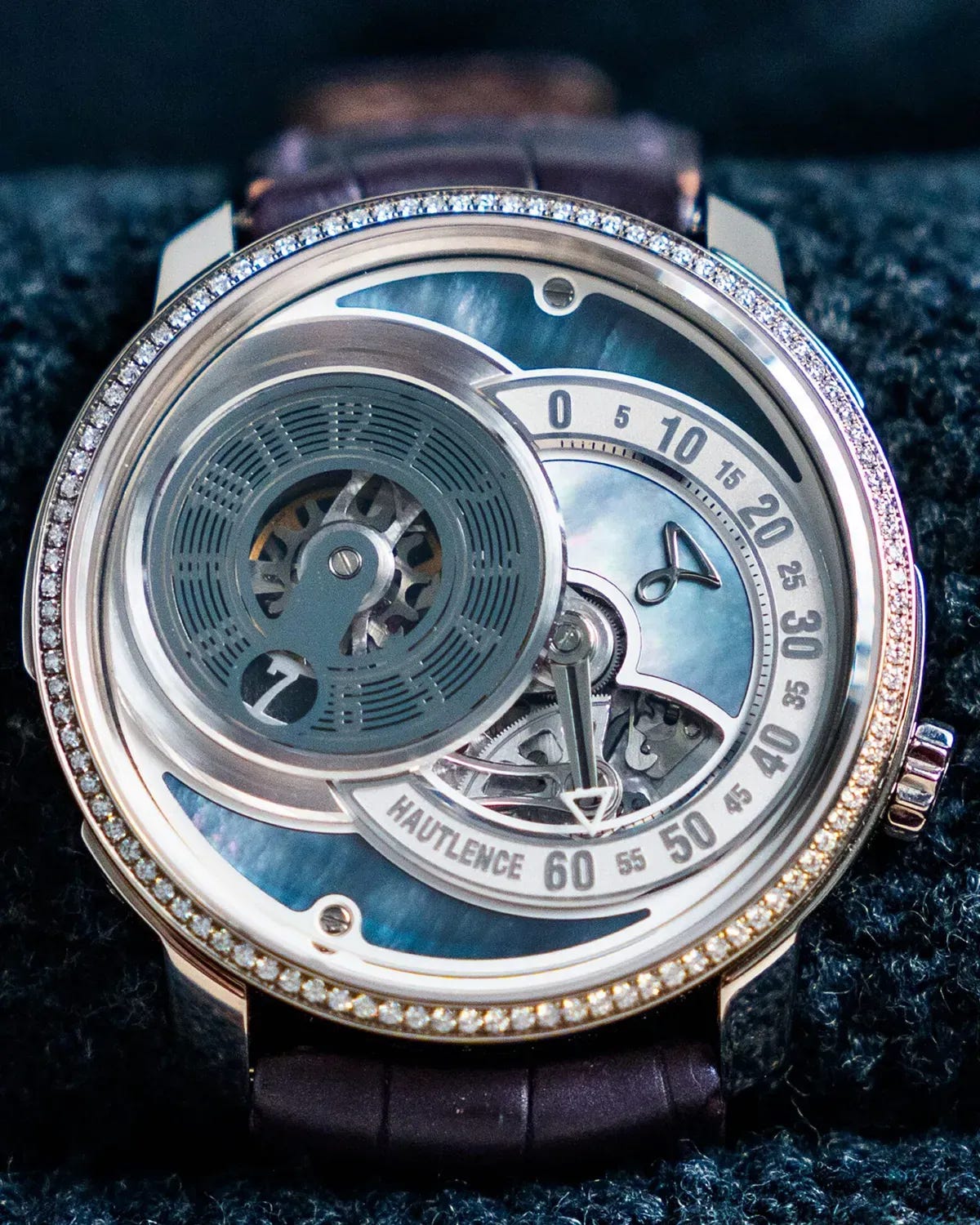 This specific HLC3 variant leans dressy and slightly mischievous. The case is 41mm in white gold, and at least some HLC 03 executions are diamond-set (and commonly described that way in auction and market listings), with a mother-of-pearl dial that softens the whole composition into something closer to “avant-garde formal” than “tool watch cosplay.” The movement architecture for the model family is typically manual-wind, built to drive the jumping hour and the retrograde minute sweep, and the watch is part of a limited edition run of 88 pieces, which is the sort of number independents love because it sounds exclusive without sounding like a joke.