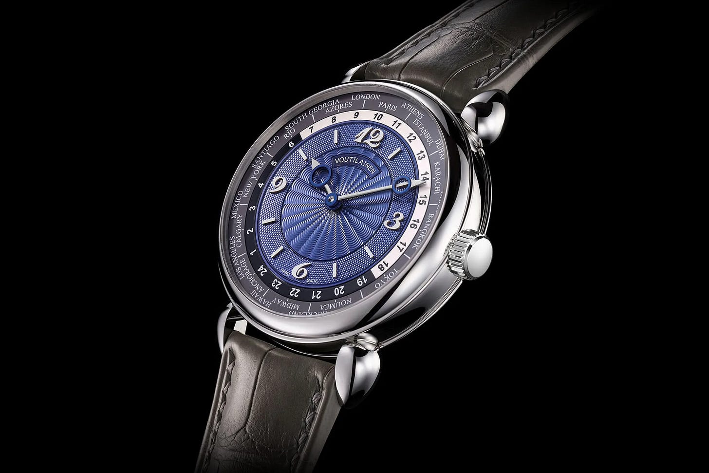 The Voutilainen 216TMZ Worldtime is a 39mm stainless steel world-timer that pairs a hand-guilloché blue dial with Kari Voutilainen’s direct-impulse double escapement movement. It offers an intuitive 24-time-zone display via a rotating city ring and central hands, backed by a 65-hour power reserve and a finely tuned balance spring system. Hand-decorated German silver plates and bridges, along with a grey crocodile strap, underscore its haute horlogerie credentials. Priced at CHF 183,500 before tax, it converts to roughly $230,500 based on the latest exchange rate and can be customized with options like a personalized city disc and dial.