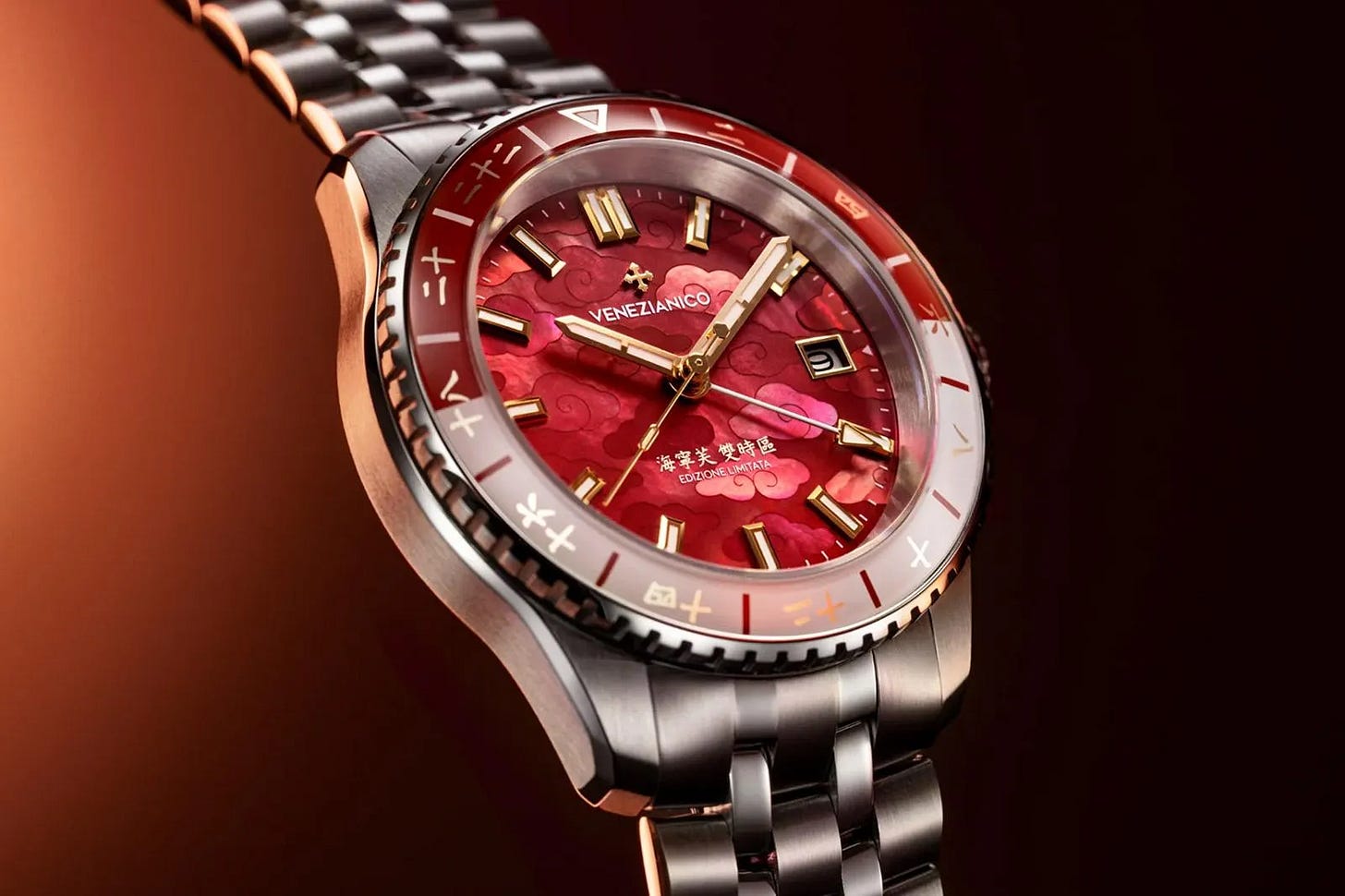 The Venezianico Nereide GMT Xi’an is a 500-piece limited edition that celebrates the Silk Road and its link between Europe and East Asia. Its red mother-of-pearl dial, accented with a cloud motif and gold hands, symbolizes good fortune, while the rotating bezel with Chinese numerals and day–night indication allows tracking of multiple time zones. Powered by the Miyota 9075 automatic GMT movement with a 42-hour power reserve, it blends Italian design with Chinese cultural references, including a Terracotta Army engraving on the caseback. Water-resistant to 100 meters on a stainless steel bracelet, it is priced at $1,095.