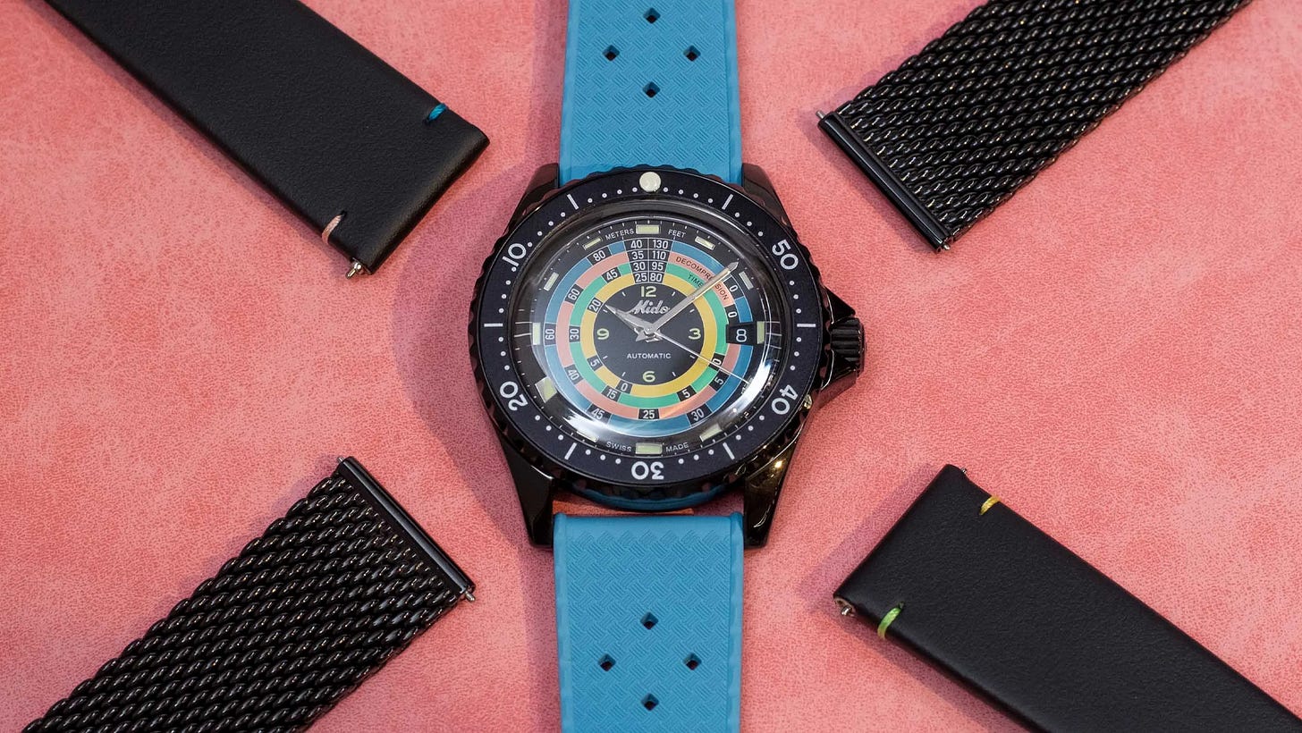 The Mido Ocean Star Decompression Timer 1961 Limited Edition in black PVD revisits a historically important decompression-dial diver with a bolder, modern execution. Its 40.5mm case and colorful pastel dial preserve the original’s ability to help divers calculate safe ascent times, while delivering 200 meters of water resistance for contemporary use. Powered by the Mido Caliber 80, the watch offers an 80-hour power reserve and ships with multiple easily swappable straps, including a Milanese bracelet and rubber option. Limited to 1,961 pieces and priced at A$2,350, it combines functional tool-watch credentials with distinctive vintage charm.