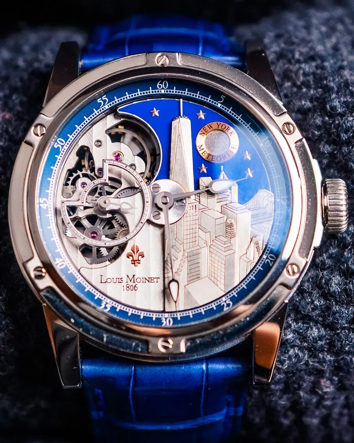 Louis Moinet has built its modern reputation around the fusion of high horology and narrative-driven design, often incorporating meteorite material, celestial references, and sculptural movements. The Mecanograph collection is central to that identity, showcasing partially openworked movements that allow the mechanics to play a visual role rather than remain hidden. In the New York edition, that philosophy is paired with a tribute to one of the world’s most iconic cities. The dial features an engraved New York skyline rendered in relief, set against a blue background and layered over a genuine meteorite plaque—a signature Louis Moinet touch that subtly ties the city’s earthly ambition to something far more cosmic.
