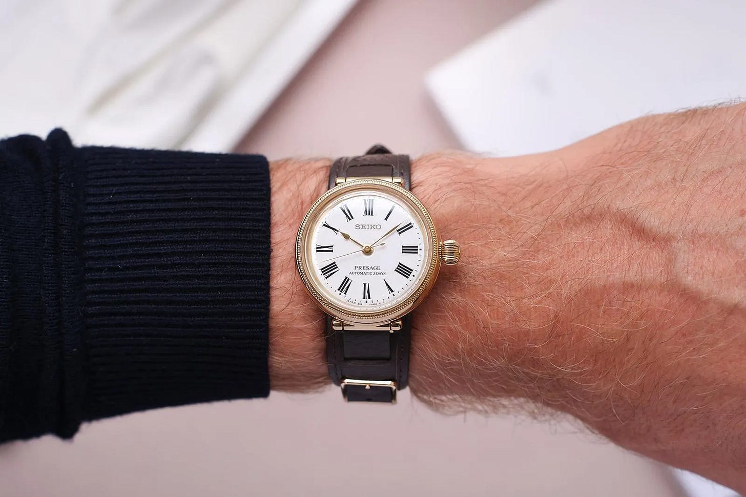 The Seiko 145th Anniversary Presage Classic Series Enamel ‘Timekeeper’ Limited Edition pays tribute to the brand’s first Timekeeper pocket watch from 1895. Its petite 35mm gold-colored steel case, onion crown, and double-knurled detailing translate pocket-watch DNA into a refined wrist format. A white enamel dial with bold Roman numerals and a pared-back layout emphasizes legibility and classical charm, while the 6R51 automatic movement delivers a 72-hour power reserve and 50m of water resistance. Limited to 1,450 pieces and priced at £1,700, it showcases Seiko’s enamel artistry and heritage-minded design in a compact dress piece.