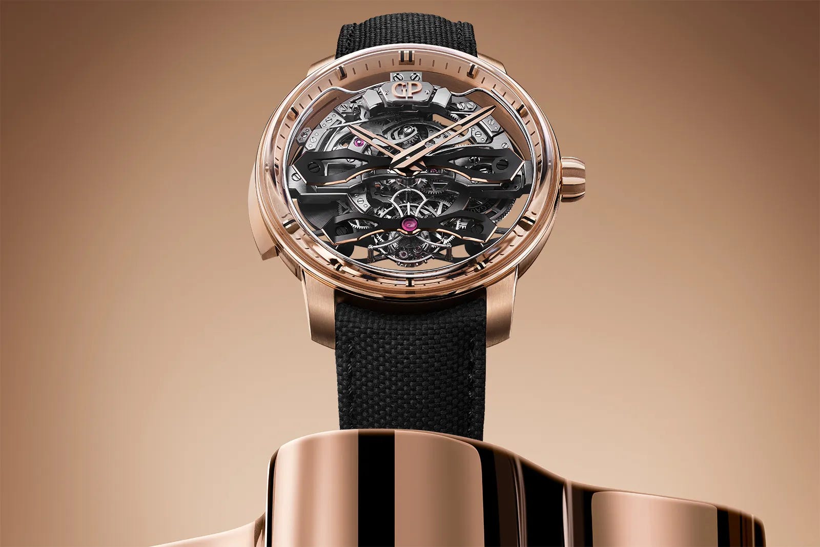 Girard-Perregaux’s Minute Repeater Flying Bridges showcases the new in-house GP9530, combining a minute repeater and tourbillon in a highly openworked, “floating” style presentation. Set in a 44mm pink gold case, the skeletonized architecture is designed to put the mechanics front and center while maintaining a cohesive, mostly monochrome palette against the warm metal. The piece signals the brand’s renewed emphasis on serious complications and fine finishing, including extensive hand work and elaborate beveling across the movement components. It delivers a 60-hour power reserve and 30 meters of water resistance, blending traditional complication-making with a modern visual language.