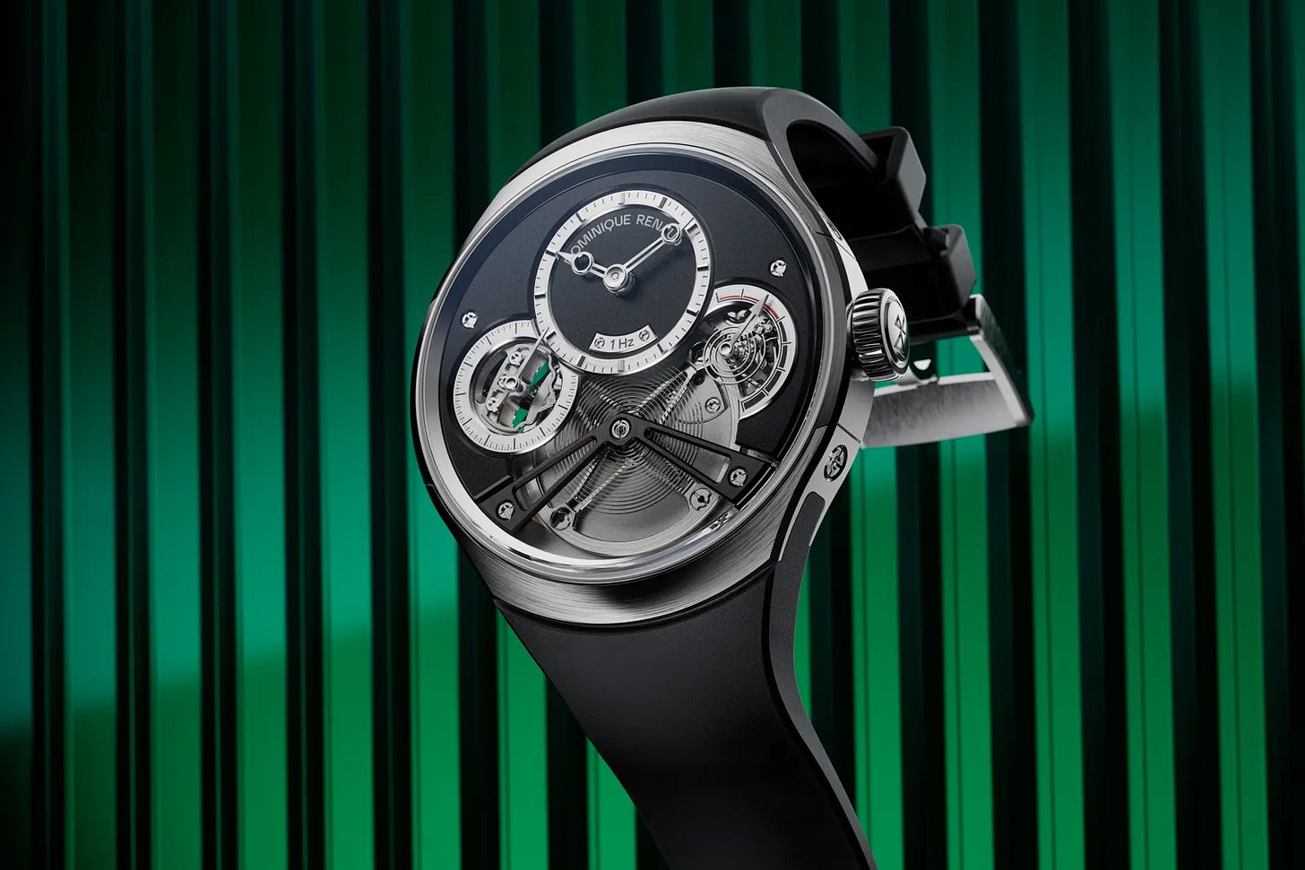 Dominique Renaud’s Pulse60 is built around a slow-beat 1 Hz oscillator, designed so the seconds hand advances in half-second steps for a distinctive cadence. The watch is offered in multiple versions (including titanium and 18k pink gold) and spotlights a very large balance and unconventional escapement engineered to avoid the amplitude limitations that often come with low frequency. Despite the technical focus, it’s sized for daily wear at 40 mm and uses manual winding with a 96-hour power reserve. Pricing starts at about $62,932 (from CHF 49,000 at roughly 1 CHF ≈ $1.284).