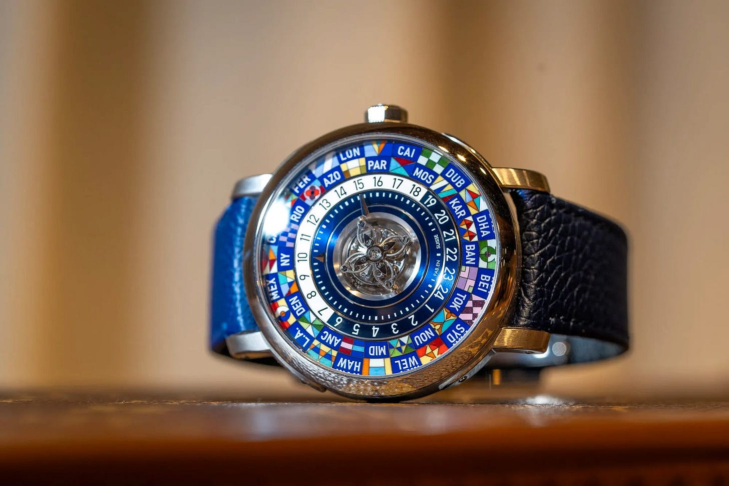 The 44mm platinum case gives the watch the physical presence to match its conceptual ambition. This is not a discreet Calatrava slipping under a cuff. This is a statement piece, and the deep blue dial—arguably one of the most mesmerizing in modern watchmaking—only amplifies that effect. Even in a pre-owned condition with minor wear and a slightly tired strap, the essence of the watch remains untouched because the real value here is in the display itself. If the dial is intact, the universe is intact.