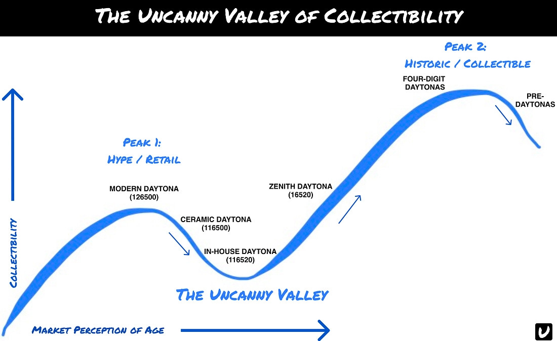 This piece by Tony Traina (needs to be Hodinkee) argues that “collectibility” often emerges only after a watch passes through an awkward middle period following discontinuation—no longer current, but not yet vintage. In that “Uncanny Valley,” many models fade from attention before being rediscovered and reevaluated years later, sometimes gaining renewed cultural and market significance. Whether a watch escapes that limbo depends on factors like historical importance, distinctive manufacturing or design traits, and lasting aesthetic appeal. It also points to how collectors’ shifting tastes can elevate overlooked references as they reassess past eras and what will matter long-term.