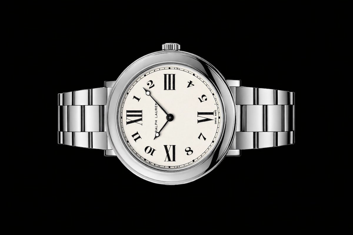 The Ralph Lauren 888 38 mm is presented as a sleek, dress-leaning steel watch with a polished bracelet and a notably slim 6.10 mm case that fits easily under a cuff. Its white lacquer dial uses a distinctive mix of Roman and Arabic numerals with Breguet-style hands for crisp legibility. Power comes from the Swiss quartz Calibre RL057, with an estimated five-year battery life, prioritizing convenience while keeping the aesthetic traditional. The listed price is $1,850.