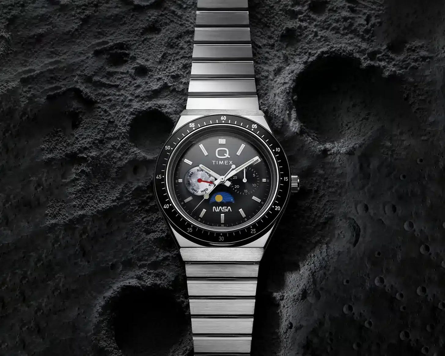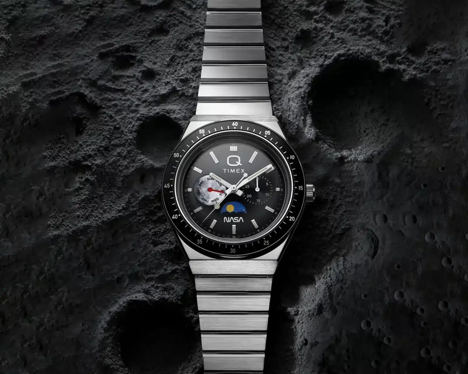 The Q Timex NASA is framed as a restrained, well-executed tribute to Apollo 17 that focuses more on design coherence than on loud co-branding. Its 40mm case, heavily domed acrylic crystal, and tapered flat-link bracelet lean hard into vintage styling, while the tri-compax layout is used for calendar functions rather than traditional chronograph timing. Small touches—like the “Blue Marble” caseback—add charm without becoming gimmicky, even if the tachymeter-style bezel reads as decorative more than functional. Price is $249 USD on bracelet or $229 USD on leather strap.