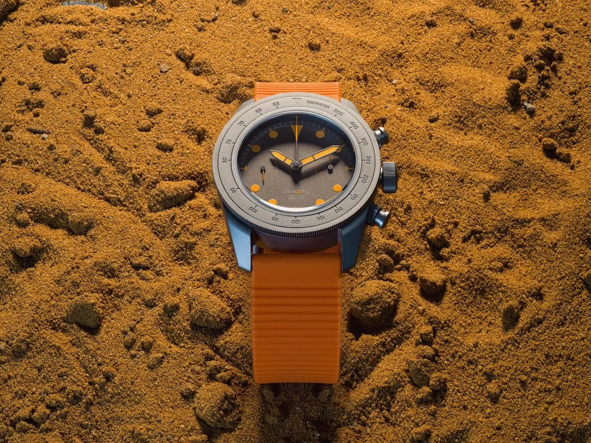This collaboration ties Unimatic to Automobili Amos and SEASE, resulting in a purpose-built titanium chronograph that emphasizes rugged clarity and a clean, utilitarian aesthetic. The 40mm sandblasted titanium case and 300m water resistance lean into “all-conditions” credibility, while orange accents on the titanium-gray dial add high-visibility character. Production is extremely limited at 30 pieces, with each watch numbered and delivered with co-branded kit to reinforce its exclusivity. The price is about $5,187 USD (€4,510; listed as approximately $5,200 in the entry).