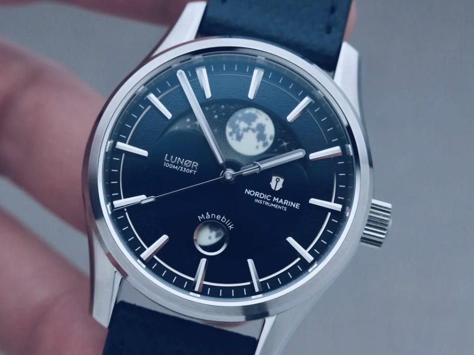 This review focuses on the Lunør Atlantic Blue’s unusual pairing of a moonphase complication with a sturdy, sports-watch build. It uses a Miyota 9015 with a custom moonphase module designed to track the lunar cycle accurately, and it leans into visual drama with a crescent window plus the “Måneblik” aperture and a glowing moonphase disc. The case is described as muscular and angular at 39mm, with 100m water resistance, making it a realistic daily wearer rather than a delicate complication piece. Pricing in the entry is $899 USD, with availability starting March 25, 2026.