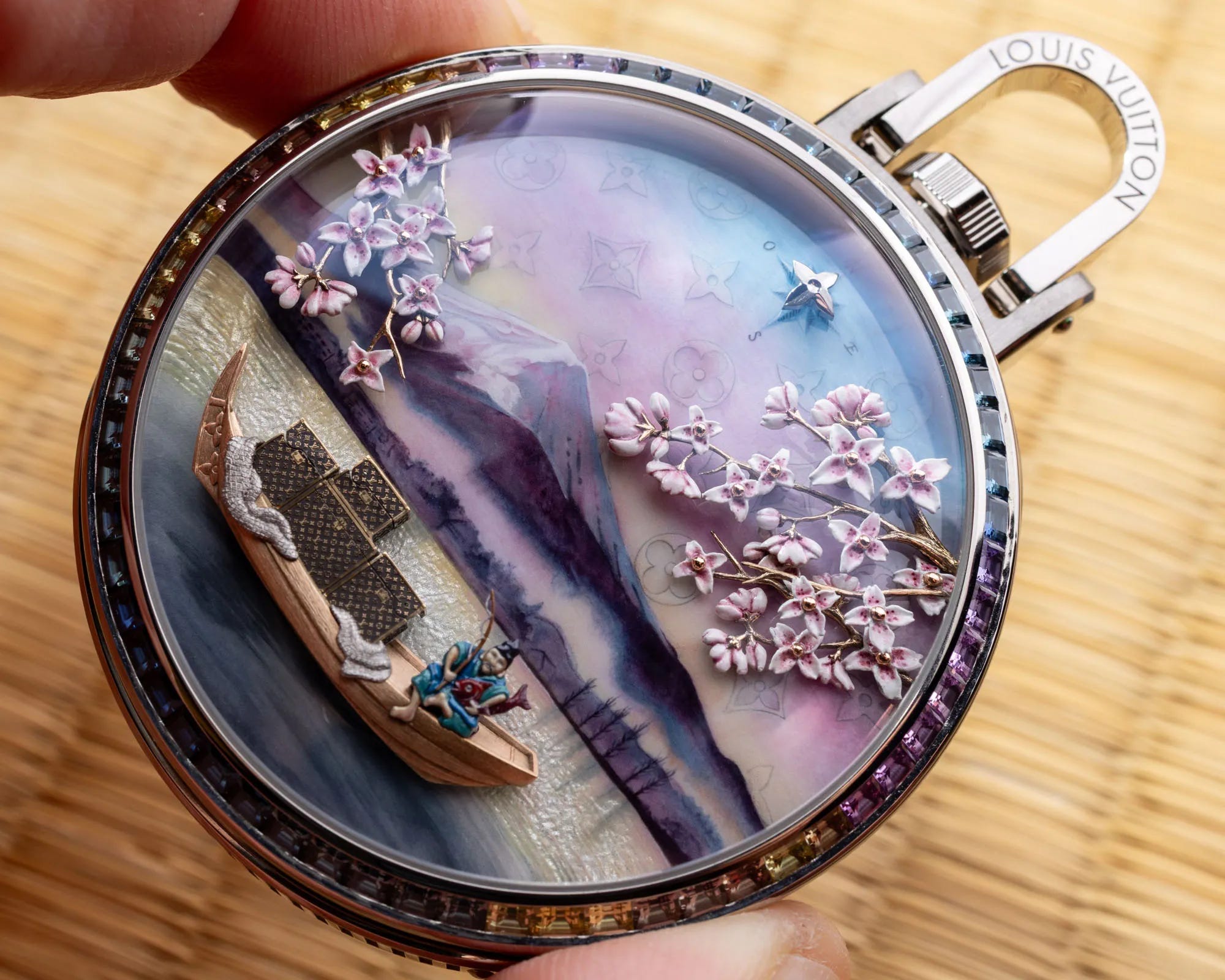 Louis Vuitton’s Escale Au Mont Fuji pocket watch is described as an elaborate minute-repeater automaton built around a springtime Mount Fuji scene rendered in hand-painted enamel with sakura blossoms. Activated via the repeater lever, the automaton animates multiple elements while chiming the time, turning the piece into both a timekeeper and a miniature moving artwork. Inside is the in-house calibre LFT AU14.03 with 561 components, combining a chiming minute repeater with a tourbillon and extensive finishing, while the bezel is set with 60 baguette-cut sapphires. With a price of €1,300,000, it’s framed as an ultra-rare collector object delivered with a bespoke Louis Vuitton presentation trunk.