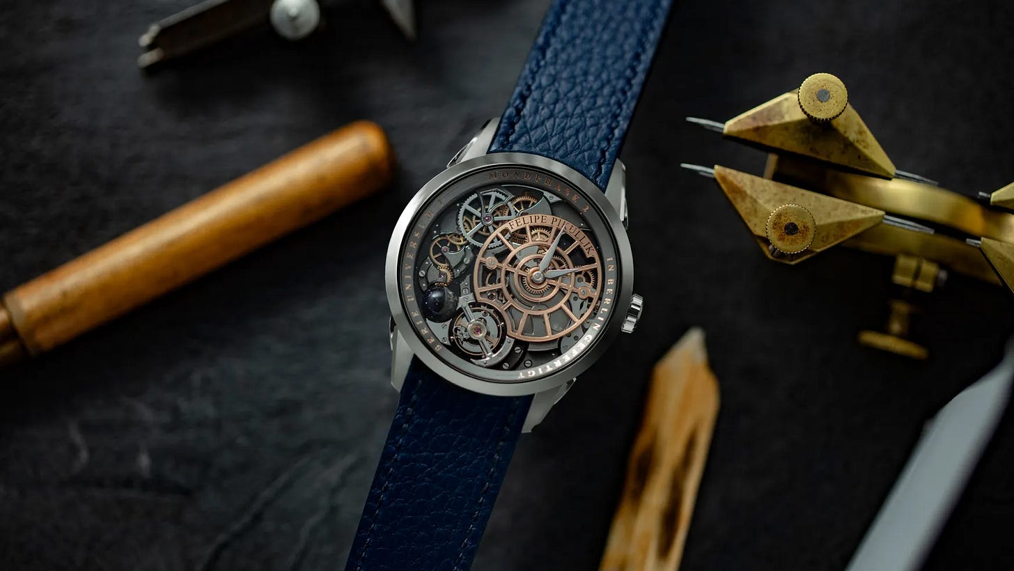 Felipe Pikullik’s Mondphase II introduces the brand’s first in-house calibre FPMP2 with a separate module for setting and winding, showcasing a more artistic, openworked architecture. The 41mm hand-wound watch features hours, minutes, moonphase, and 24-hour indications, with about 40 hours of power reserve. Limited to 20 pieces per case material across steel, bronze, and platinum, it emphasizes both craft and scarcity. Price: €45,000 (steel), €58,000 (bronze), €65,000 (platinum).