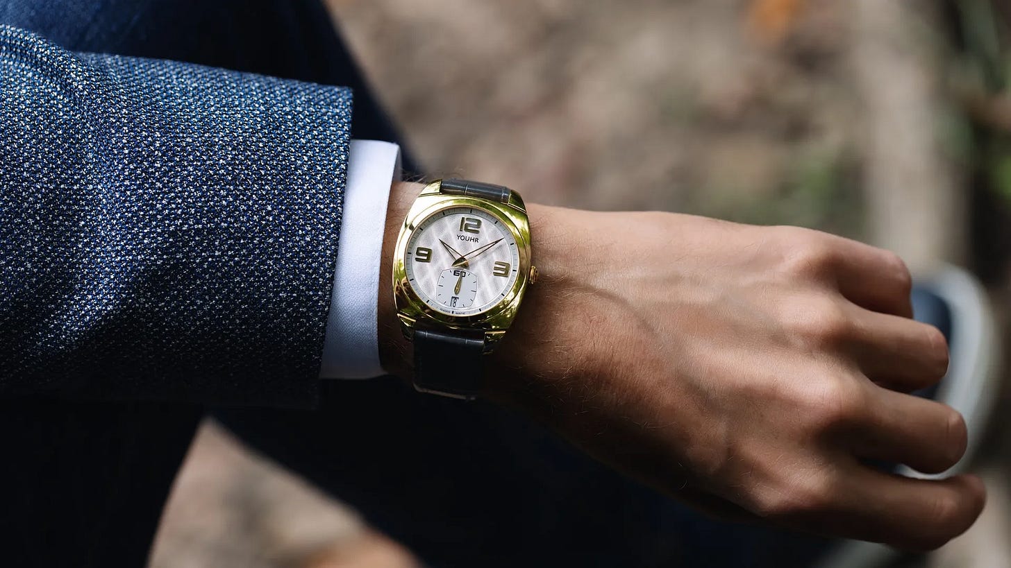 Veteran watchmaker Roland Gloor launches YOUHR ONE, an ultra-flat 39×40mm gold dress watch just 8.2mm thick, blending round-square geometry and hand-finished integrated lugs. A hand-guilloché dial, openworked rhodium dauphine hands, and Arabic numerals frame the Vaucher 5400-based ultra-thin automatic with 48 hours of reserve. Designed with Jacqueline Dimier, the piece channels “perfect lines” and quiet luxury. Price: CHF 38,800.