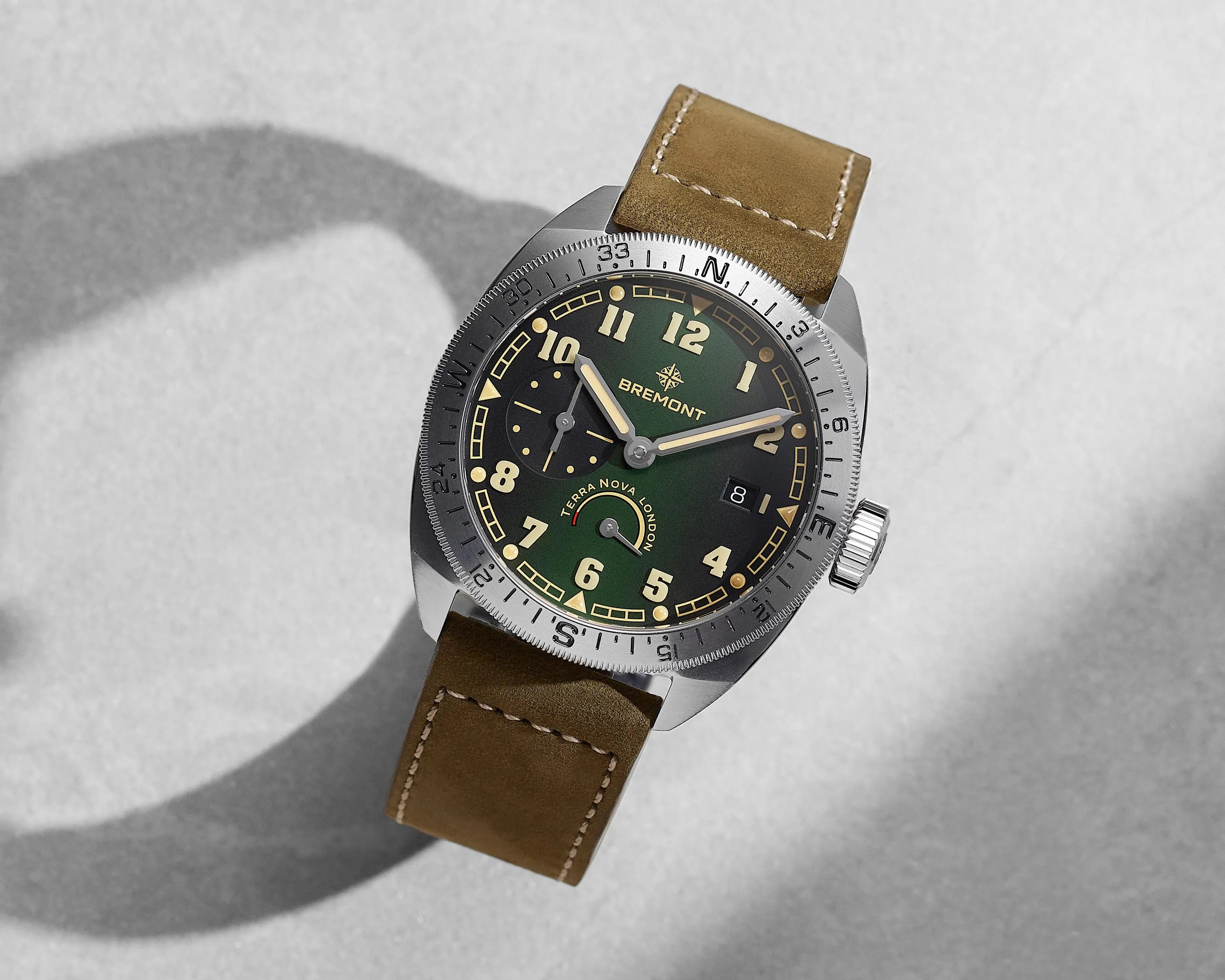 Bremont’s Terra Nova Turning Bezel Power Reserve debuts in NYC with a gradient black-to-green dial, satin radial-brushed steel case, and a bi-directional compass bezel. The 40.5mm piece adds small seconds and a power reserve display, pairing legible markers with a brown nubuck strap. Limited to 50 pieces with 100 meters of water resistance, it’s powered by the automatic Bremont BB-556AH with a 41-hour reserve. Price: $4,250.