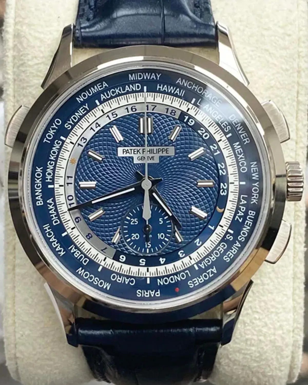 The basics are all here and nicely executed. The 39.5mm white-gold case wears compact but substantial, with a simple polished bezel that leaves your attention on the dial. The blue center is hand-guilloché in a circular motif, ringed by the 24-city disk and 24-hour ring, with applied white-gold indexes and silver-toned hands keeping the whole thing legible rather than busy. The subdial at 6 o’clock handles the 30-minute chronograph register, while a central chronograph seconds hand runs over the world-time display; it’s a lot of information, but in typical Patek Philippe fashion, it’s organized rather than chaotic. The blue leather strap and matching white-gold folding clasp finish off a package that’s firmly in the “dressy traveler” camp rather than sports-lux.