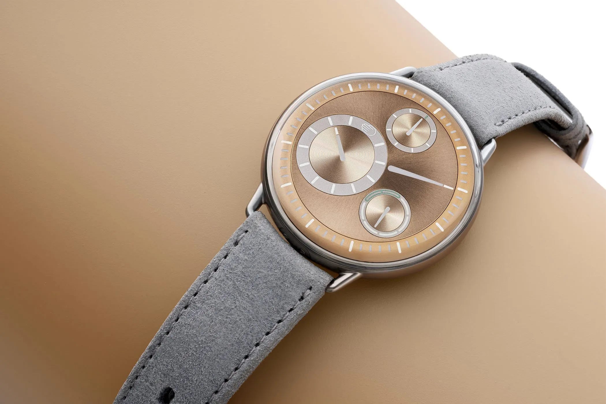 Ressence’s limited Type 1 Round RG uses a titanium “pebble” case with sandblasted mid-case, polished bezel, and double-domed sapphire to frame a warm rose gold-toned dial. The crownless ROCS system displays hours, seconds, and weekday via rotating discs on a sunray surface. Limited to 70 pieces and paired with a light grey suede strap, it’s powered by a customized automatic ETA 2892 with a 36-hour reserve. Price: CHF 18,150 (excl. taxes).