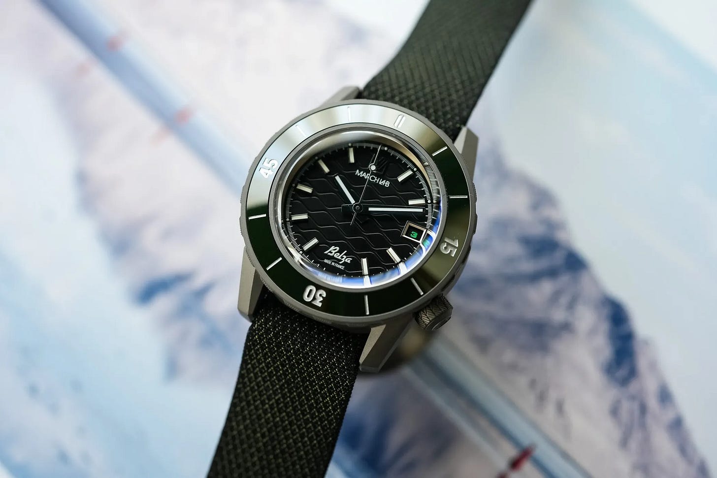 Belza returns in a 40 mm Grade 2 titanium case with 200 m water resistance, a sandblasted wave‑pattern dial, and a unidirectional bezel with green ceramic insert. Powering the watch is the Swiss La Joux‑Perret G100 automatic movement with a 68‑hour reserve. Limited to 99 pieces, it pairs French‑surf heritage cues with modern durability and a khaki‑green jacquard strap. Price is EUR 2,195.