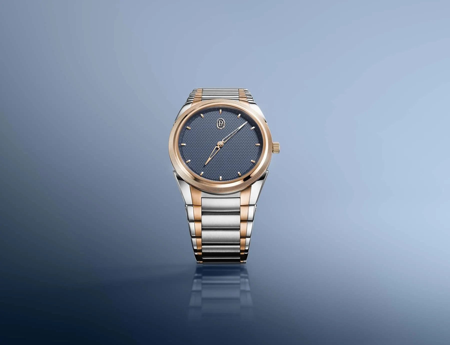 This Tonda PF Micro‑Rotor refresh blends warm rose gold accents with a shifting stone blue dial in a 40 mm, 7.8 mm‑thin case. The hand‑guilloché Grain d’Orge texture, applied indices, and skeletonized hands elevate the refined aesthetic. Inside, the ultra‑thin PF703 maintains a 48‑hour reserve and 100 m water resistance. Priced at CHF 28,200, it bridges the all‑gold and steel‑platinum variants with a distinctly modern elegance.