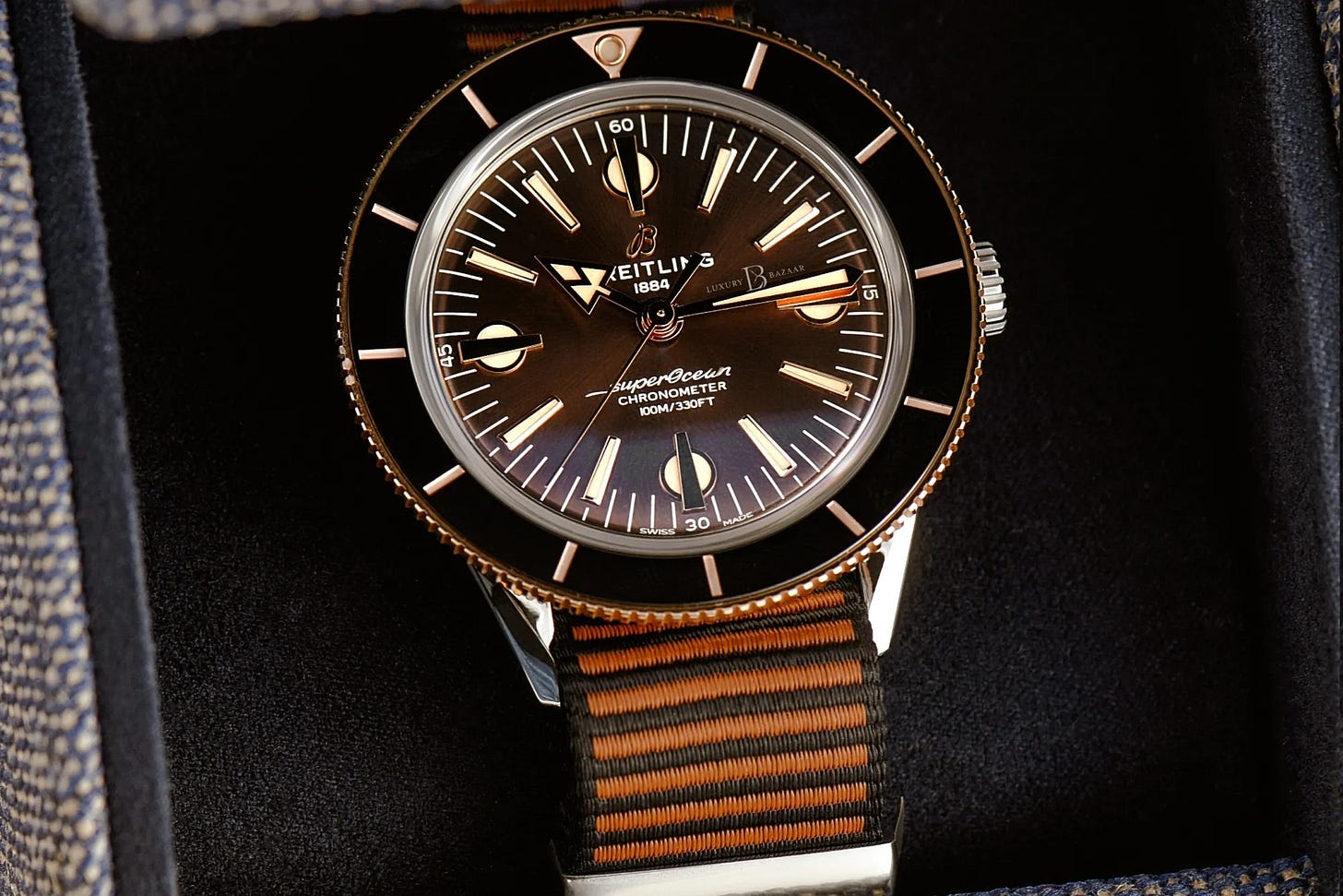 A tribute to the 1957 original, the Superocean Heritage ’57 Outerknown pairs a slim, under-10mm case with a bidirectional bezel and easy-wearing comfort. Offered in stainless steel or two-tone with rose gold bezel, it emphasizes vintage charm, legibility, and distinctive hands. The watch ships on an integrated brown Econyl strap, adding a sustainable touch to the heritage design. Prices hover around $3,000 for steel and $4,000 for two-tone, well below original MSRP.