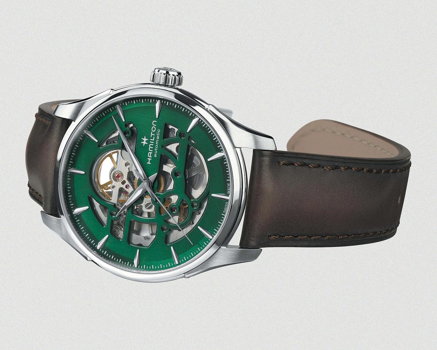 The Jazzmaster Skeleton in Empire Green reveals the H‑10‑S automatic (80‑hour reserve) through sculpted dial openings. Offered in 40 mm (green) and 36 mm sizes, it brings an elevated daily‑dress presence under $1,500. The new hue adds sophistication without sacrificing versatility. Bracelet and leather options keep it adaptable for different looks.