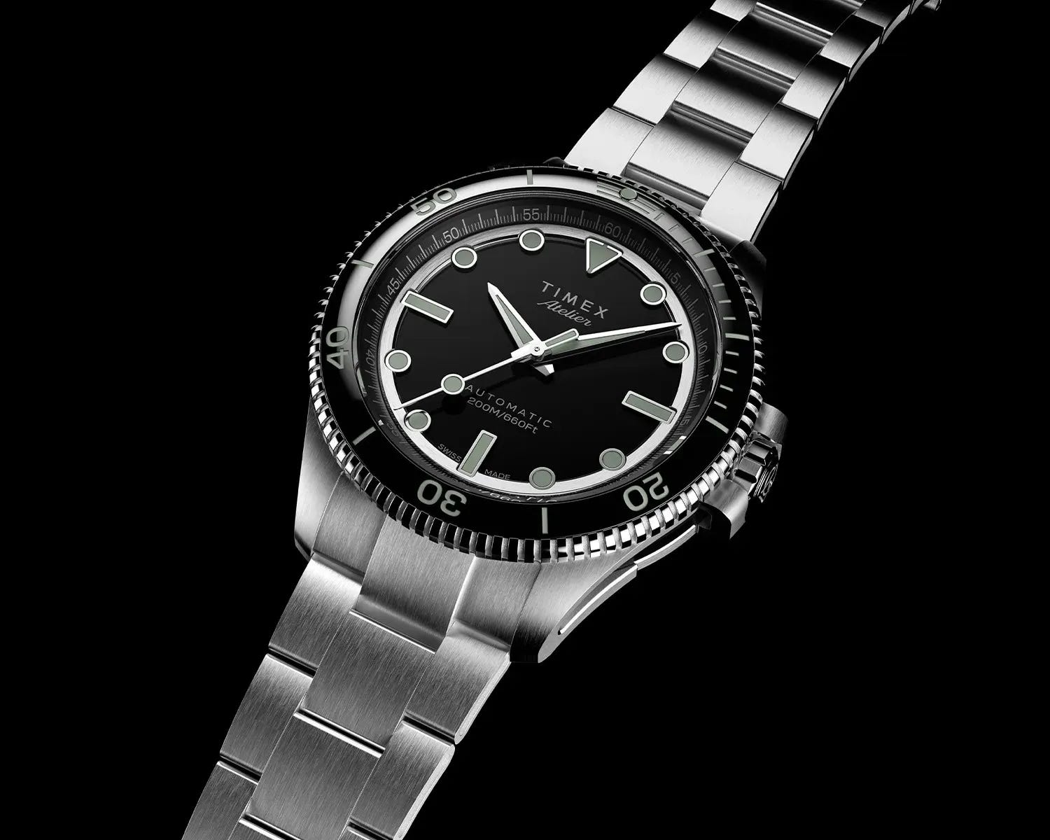 The Marine M1a debuts the Timex Atelier sub‑brand with Swiss‑made construction and a black enamel dial with Super‑LumiNova indices. A skeletonized case architecture distinguishes it from typical divers while staying wearable and refined. Priced at $950 on strap and $1,050 on bracelet, it signals a credible move upmarket. It blends accessible pricing with elevated design and finishing.