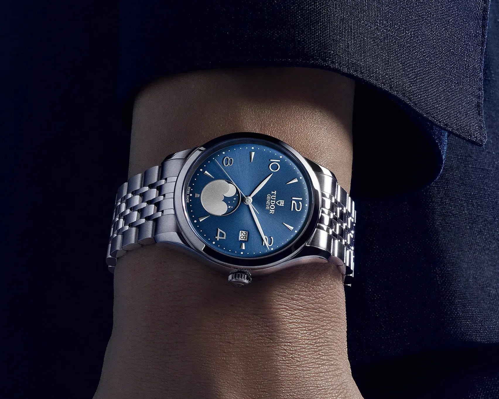 The 1926 Luna is Tudor’s first moonphase, developed with Taiwanese pop icon Jay Chou, and styled with a classical dial that nods to early twentieth‑century design. The 39 mm polished steel case houses a Sellita movement with date and an elegant moonphase display. Available in brilliant blue, black with yellow‑gold detailing, and champagne with black detailing, it retails for $2,800. It joins the standard collection with no production limit.